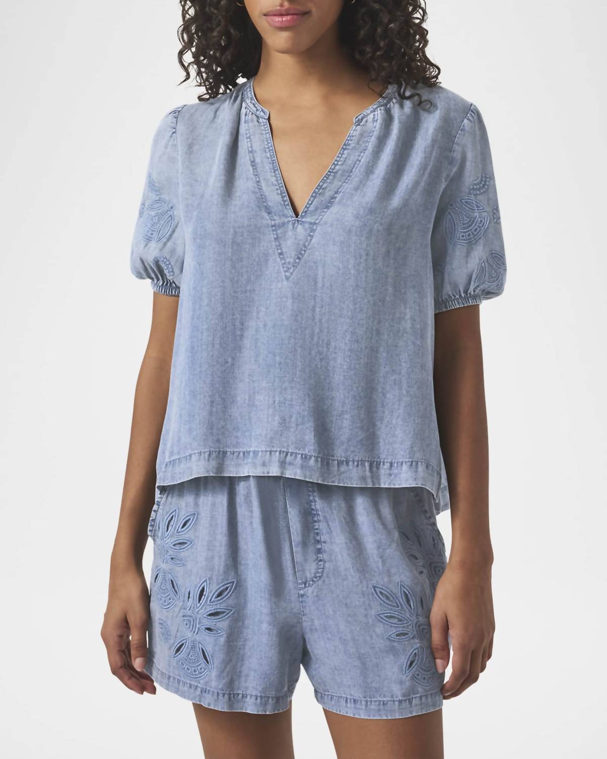 A versatile blouse that works from desk to dinner! Enhance your wardrobe with the Cayden Indigo Blouse by Splendid, a sophisticated piece designed for a touch of elegance. This women's blouse features short puff sleeves with elastic cuffs, a V-neckline, and falls at hip length with a 22" measurement from shoulder to hem. Made from a luxurious blend of lyocell and cotton, it offers a relaxed fit perfect for vacation occasions. Slipover closure design adds to its effortless style.
