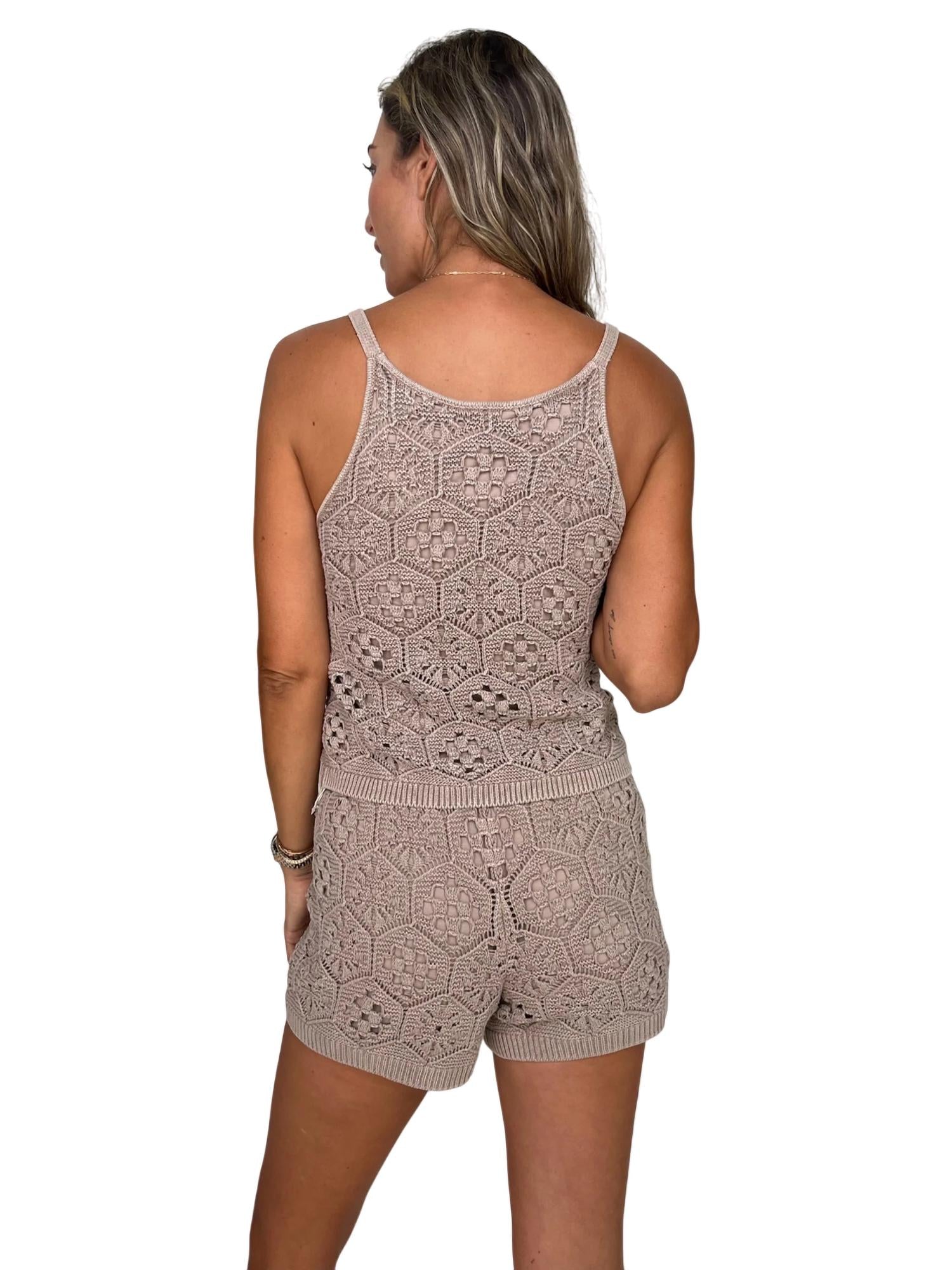Introducing the Eden Sweater Short by Splendid, a chic addition to your casual wardrobe in the elegant shade of Rattan. This short features a crochet knit texture and a convenient tie closure for a personalized fit. Made with an outer composition of 100% cotton and an inner lining of 95% viscose and 5% elastane, it offers both comfort and style. Care instructions recommend dry cleaning only to maintain its quality. Alyssa is 5'10" and wears a size small.