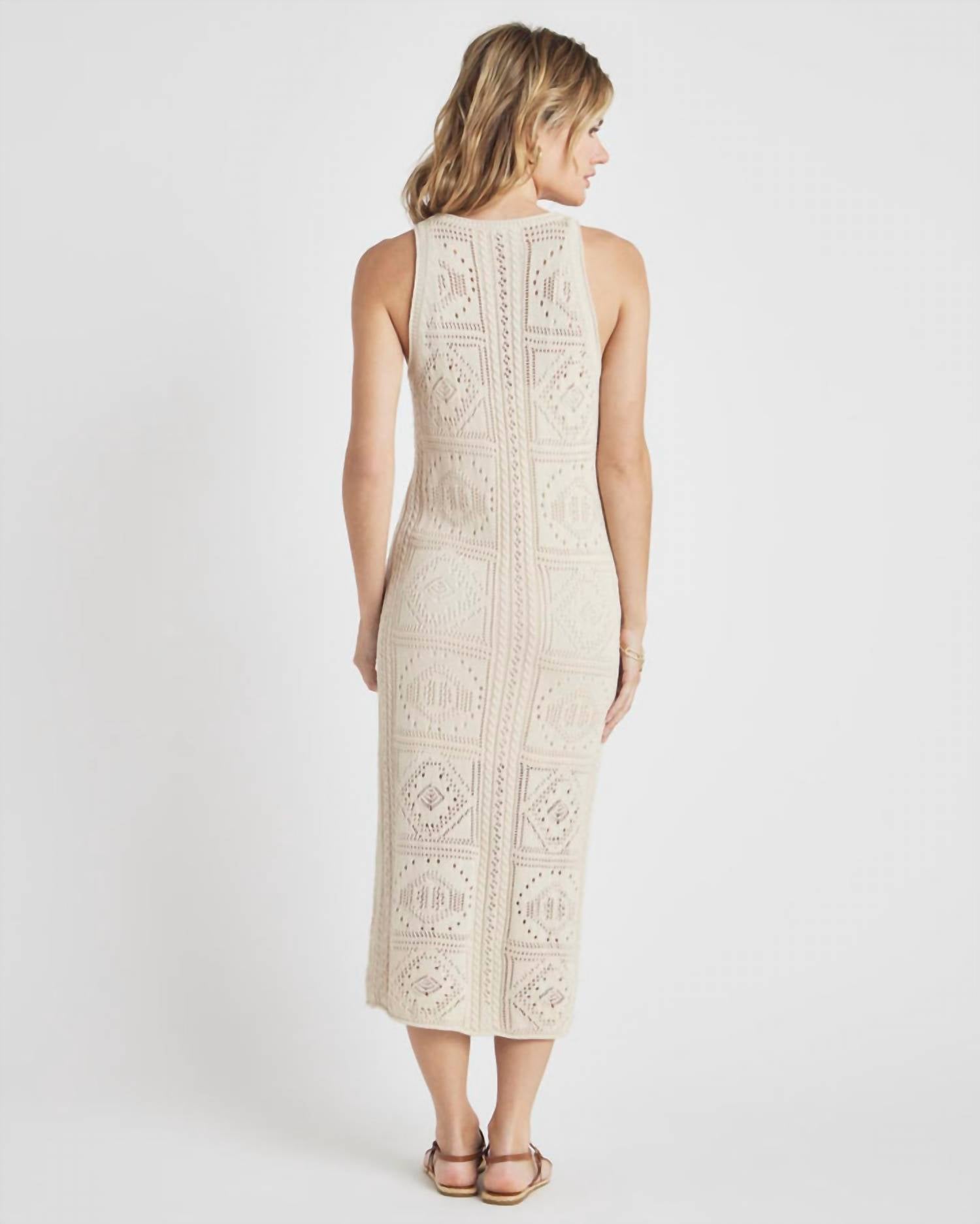 The perfect length dress does exist. This high-neck tank dress is a versatile spring staple, featuring an intricate crochet pattern with cable detailing. Crafted from a soft cotton blend, it includes a mini-length slip for added coverage and comfort. A side slit adds ease of movement and a subtle touch of allure, making it perfect for both casual days and elevated occasions.