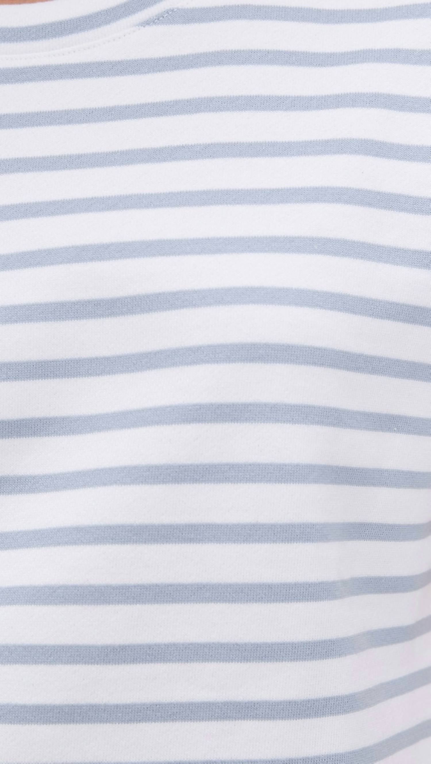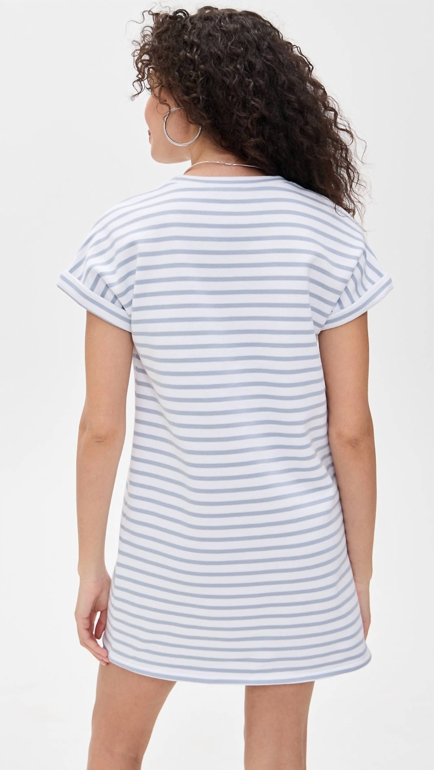 Introducing the Terry Striped Mini Dress by Splendid, perfect for a casual summer outing in White/Seaport stripes. This lightweight French terry dress reaches a mini length of 31.5 inches and boasts short, cuffed sleeves for a laid-back appeal. Crafted from 100% cotton, it features a crewneck and a pull-on design with no closure. Care instructions recommend washing cold, and this imported piece ensures comfort and style for your vacation wardrobe.