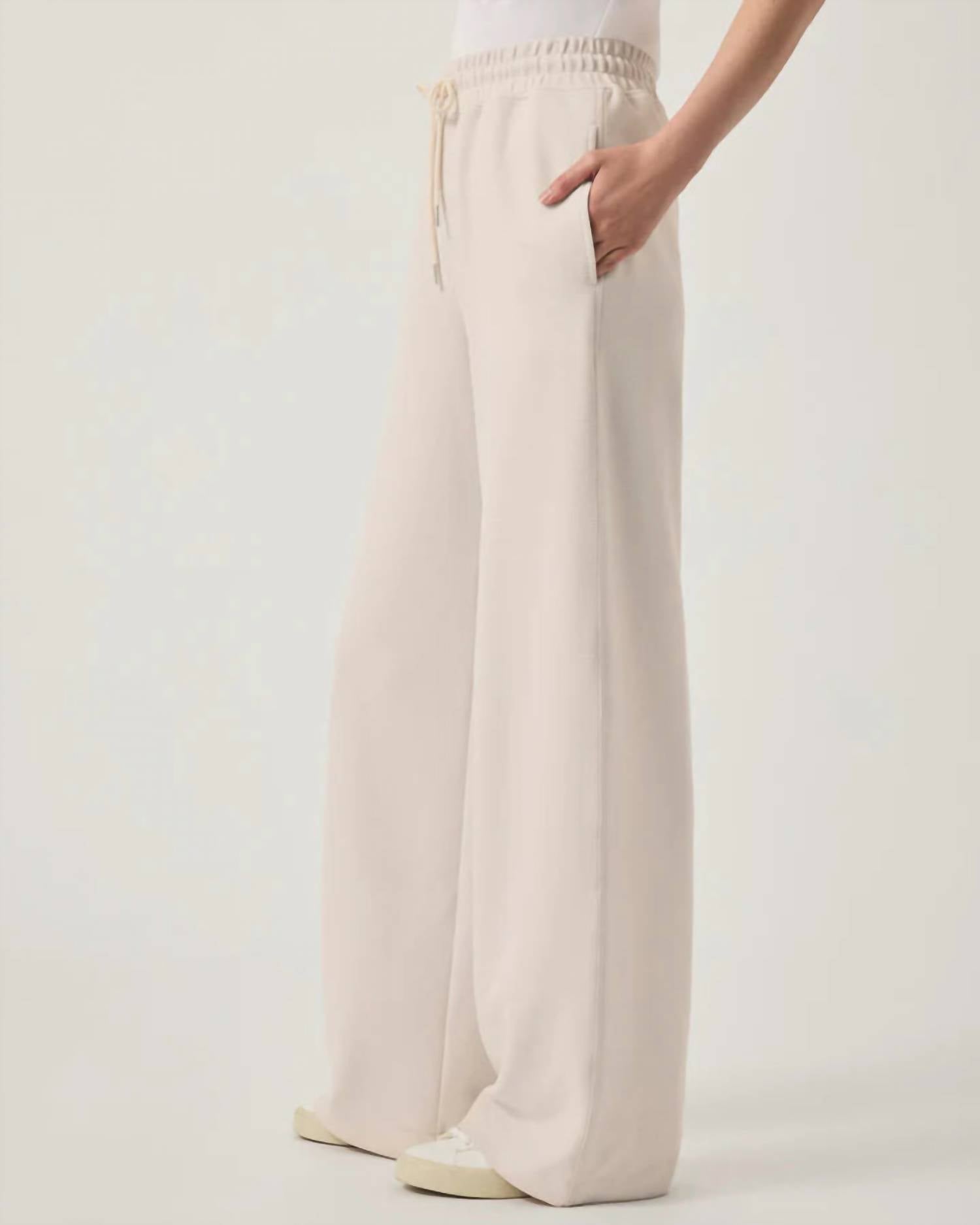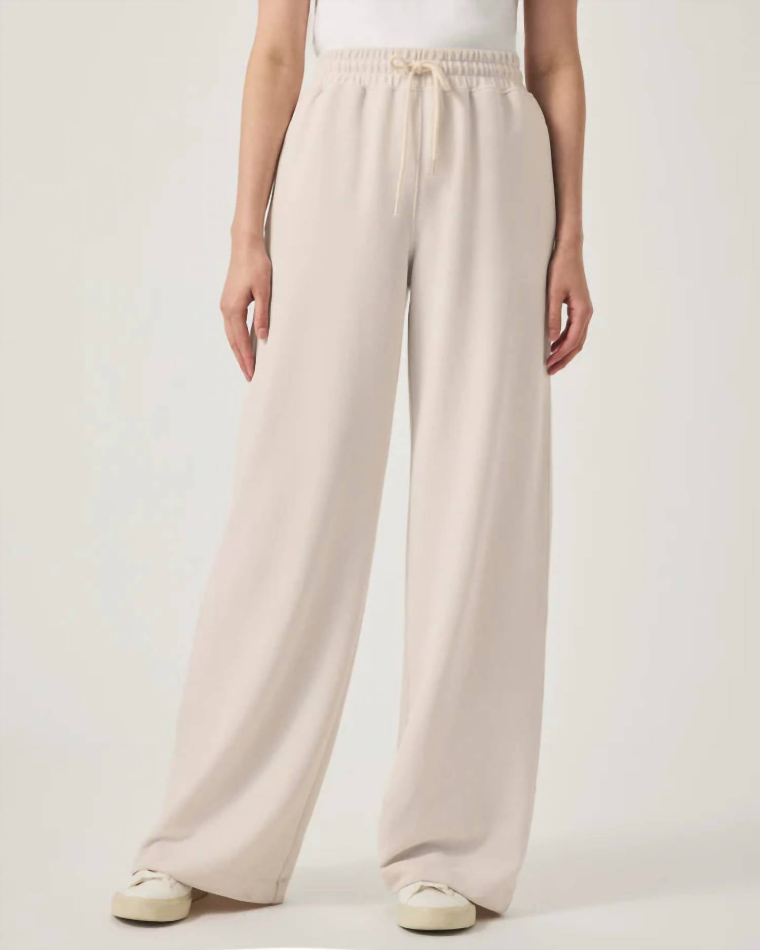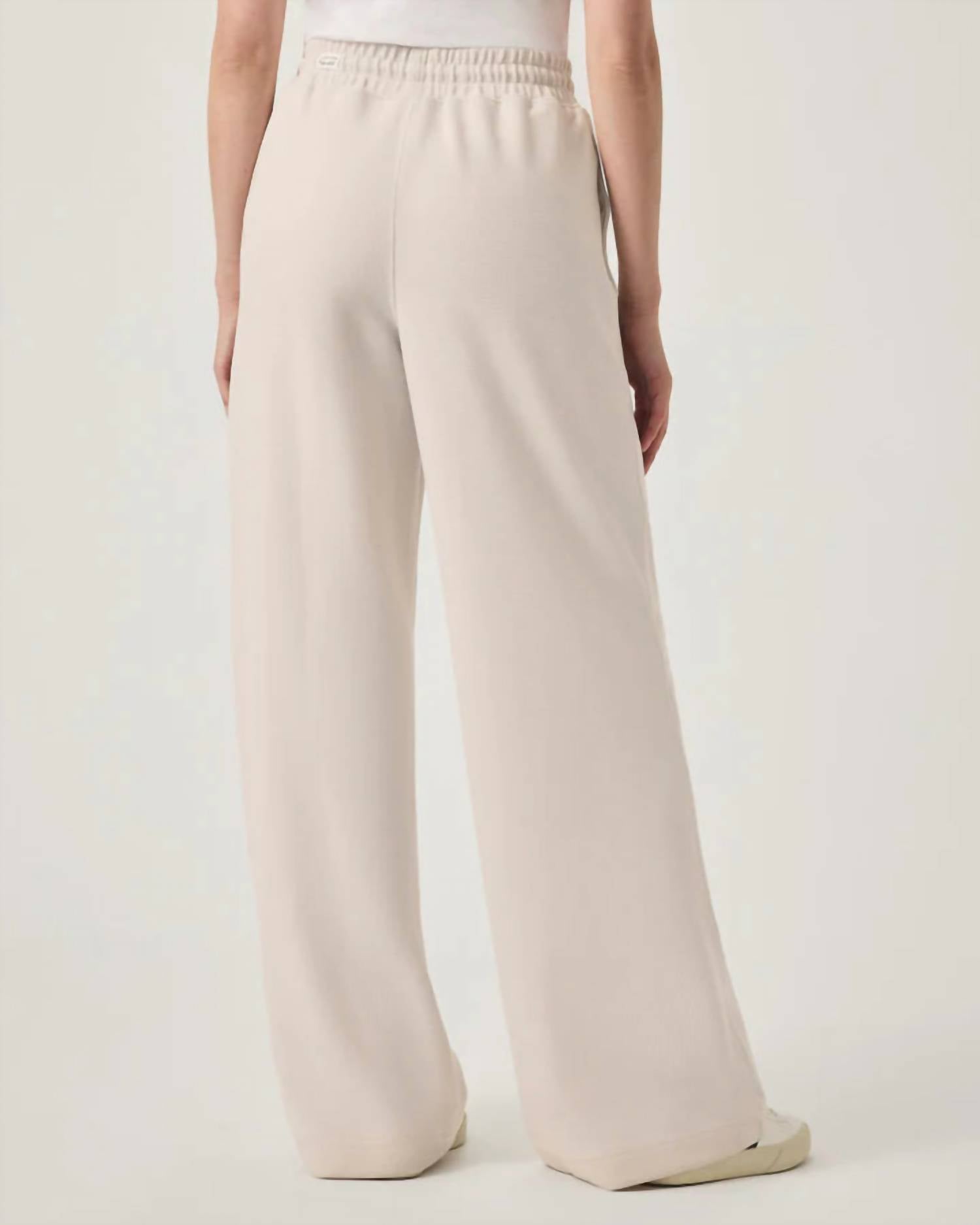 Introducing the Waffle Scuba Pants in Moonstone by Splendid, blending comfort with streetwear elegance. These pants sport a classic wide leg and feature a stretchy waistband complemented by an adjustable tie closure, perfect for casual styling. Crafted from a viscose blend with waffle knit texture, they include convenient on-seam side pockets. Care: Machine wash cold. Measurements from size small: Inseam 31 1/2", Waist 14", Front Rise 9 5/8", Back Rise 12 5/8", Leg Opening Circumference 24".
