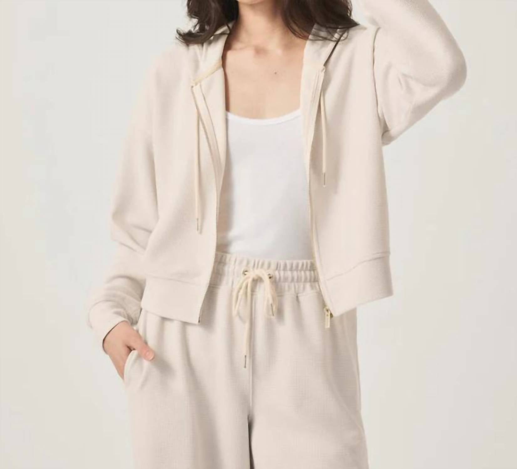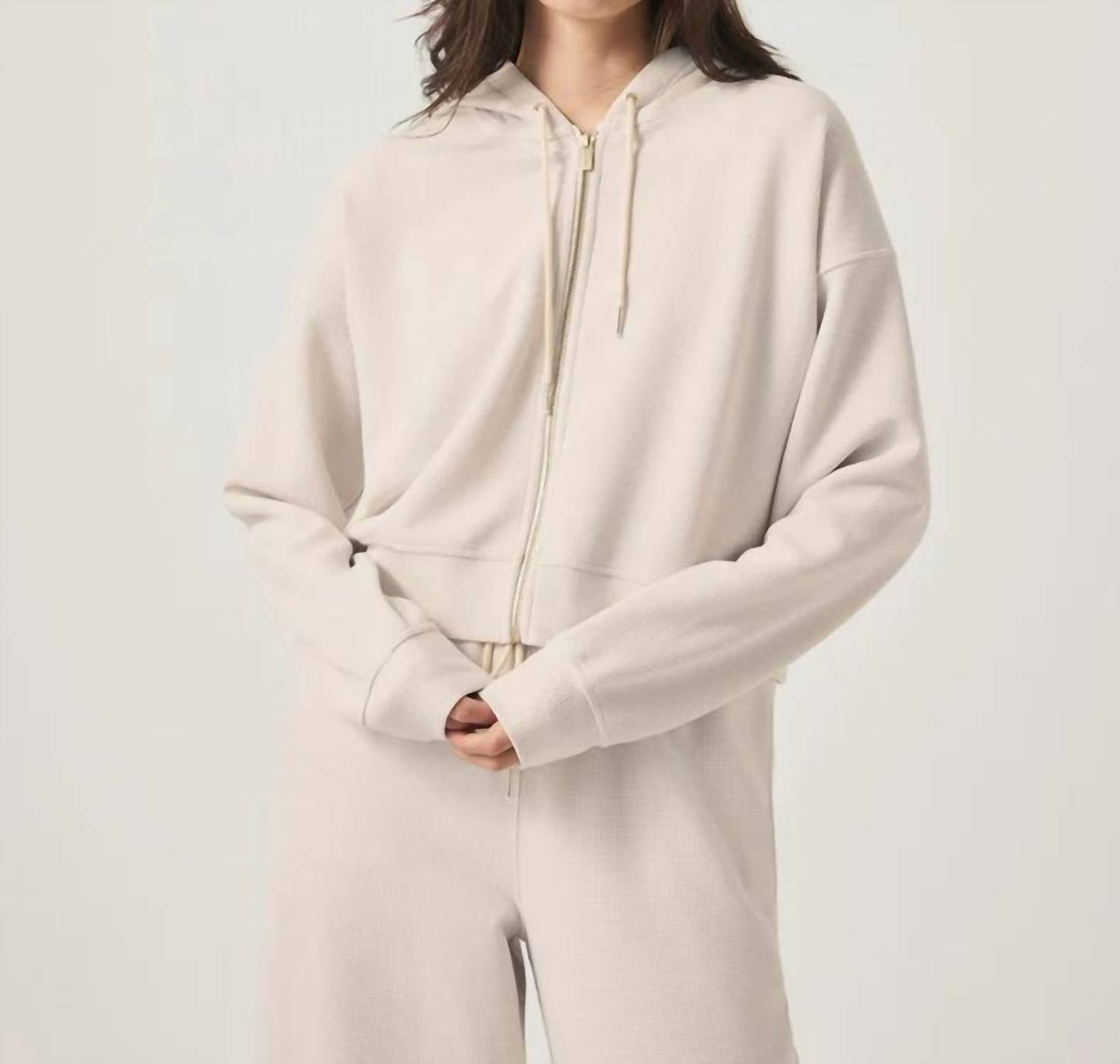 Whether you're running around town or lounging at home, this sweatshirt works for both. Introducing the Splendid Waffle Scuba Zip-Up Pullover in Moonstone, a sleek addition to any fall wardrobe. This long sleeve pullover merges the smoothness of scuba fabric with the cozy texture of a waffle knit, featuring an attached hood with a draw tie for added functionality. Composition: 50% Viscose, 42% Polyester, 8% Elastane. Closure: Zip closure. Care: Machine wash cold. Imported. With a front and back length from HPS at 20 1/4" and a chest/bust width of 22 1/2", this pullover offers a perfect fit for the minimalist fashion enthusiast.