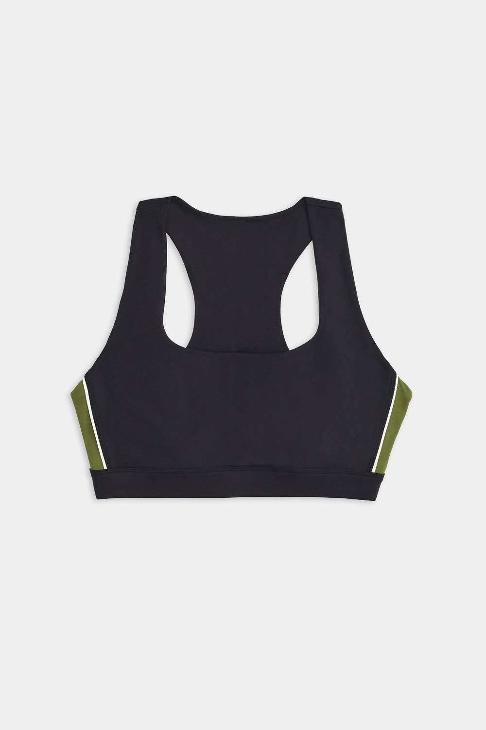 A sports bra that has it all - style, function and support. High-performance choice in chic Black/Olive. Designed with a high neckline, wide racer back, and a longer length. Offers exceptional support and coverage for high-impact activities. Composition: 62% Nylon, 38% Spandex. Perfect for running, court sports, spin class, cycling, and gym workouts.