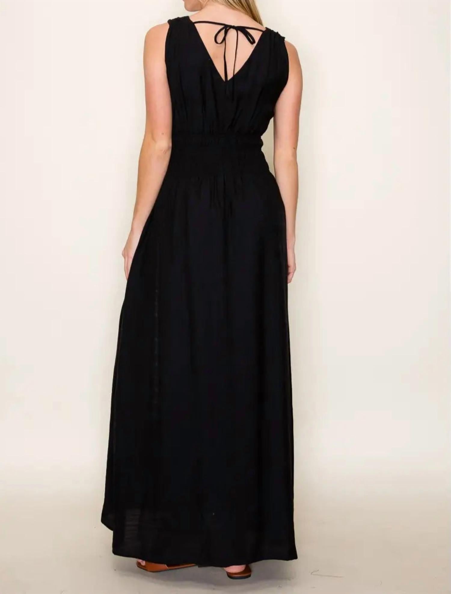 Who doesn't love a good maxi dress? This one you'll be reaching for season after season. Step into elegance with the Lola Maxi Dress by STACCATO, a chic choice for any evening event. This sleeveless solid black dress is crafted from luxurious Rayon and features a double V-Neck with a flattering smocked waist. Its A-line silhouette is complemented by a playful tied back closure, making it a summer essential. Perfectly blending quiet luxury with a seasonal touch, it's the ideal attire for special occasions like Halloween parties.