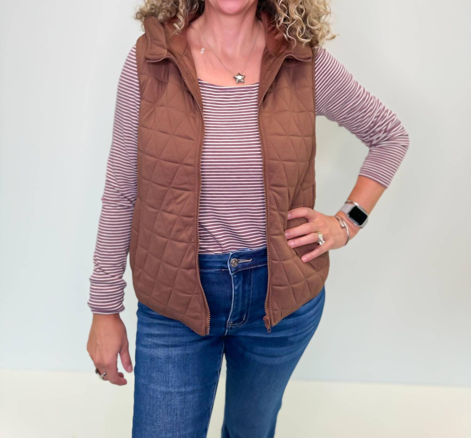 Throw this vest over an all black outfit for a perfectly polished look. Experience the Sheila Hooded Quilted Vest by STACCATO, a fabulous addition to your autumn wardrobe with its sleek sleeveless design. Crafted from thick quilted material, the vest boasts a 97% Polyester, 3% Spandex composition, ideal for soft cool brown tones perfect for summer looks. Its hooded feature and front zip closure add practicality and style, complete with convenient front pockets. To maintain its condition, simply hand wash this minimalist trend piece for ongoing enjoyment.