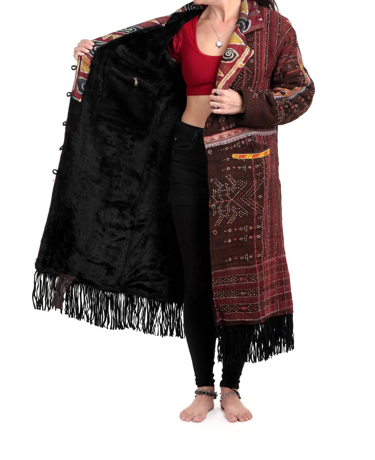 Introducing StandAwt's Signature Merino Wool Coat in a stunning brown pattern, offering a blend of elegance and warmth. This long sleeve trench coat, tailored from 100% merino wool, features a luxurious faux fur lining, ensuring you stay cozy through winter evenings. Highlights include a button closure, hand-embroidered patches, silk collar, and tassel details, complemented by practicalities like two large outside pockets and an inner secret pocket. Designed to stand out, it's machine washable and should be laid flat to dry, with specifications measuring 47" in length with fringe and a regular fit, making it a standout piece in your Boho Chic collection.