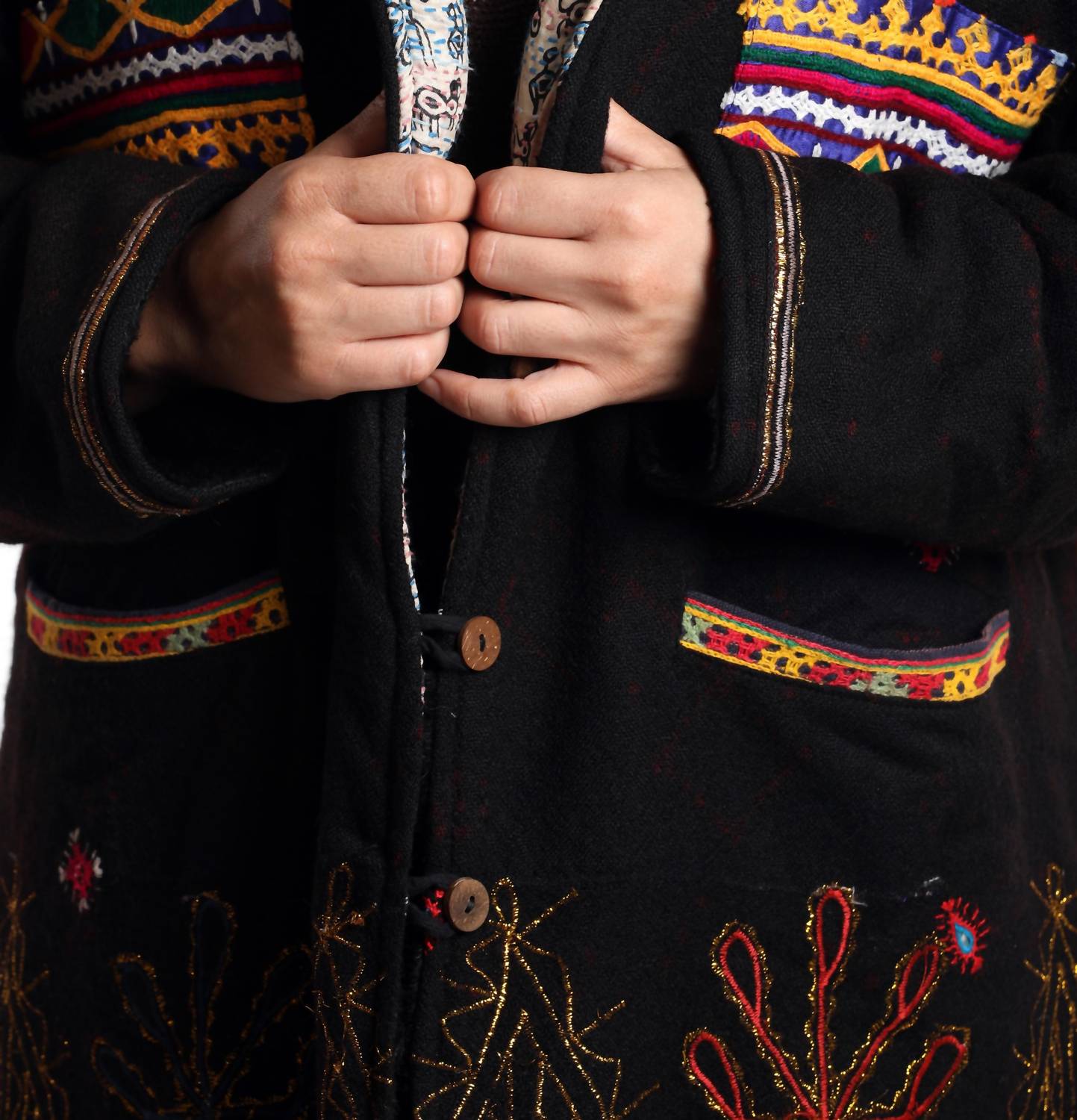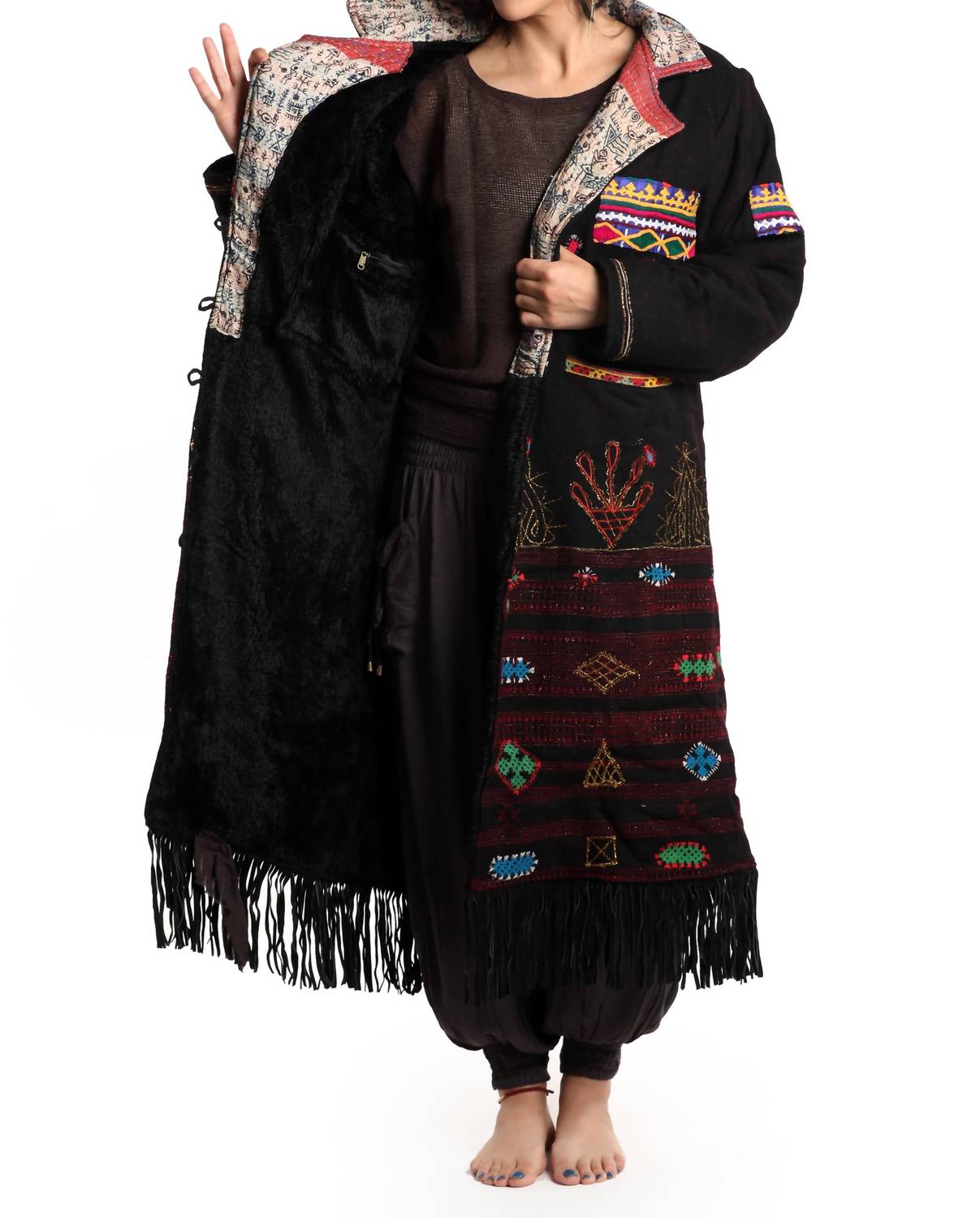 StandAwt's Merino Wool Coat is a striking winter essential that blends style and functionality with long sleeves and a rich wool exterior. This unique, patterned piece features 100% merino wool with a faux fur lining, offering warmth and comfort. It's complemented by a silk collar, hand-embroidered patches, leather fringe, and versatile tassels. With a button closure, this regular fit coat also includes two large outside pockets and a secret one to safely store valuables, as well as a reversible design for varied styling—truly a collectible piece. Dimensions: Chest: 21”, Length with fringe: 47”, Sleeves: 23", designed for a bold, boho-chic look. Please hand wash and lay flat to dry.