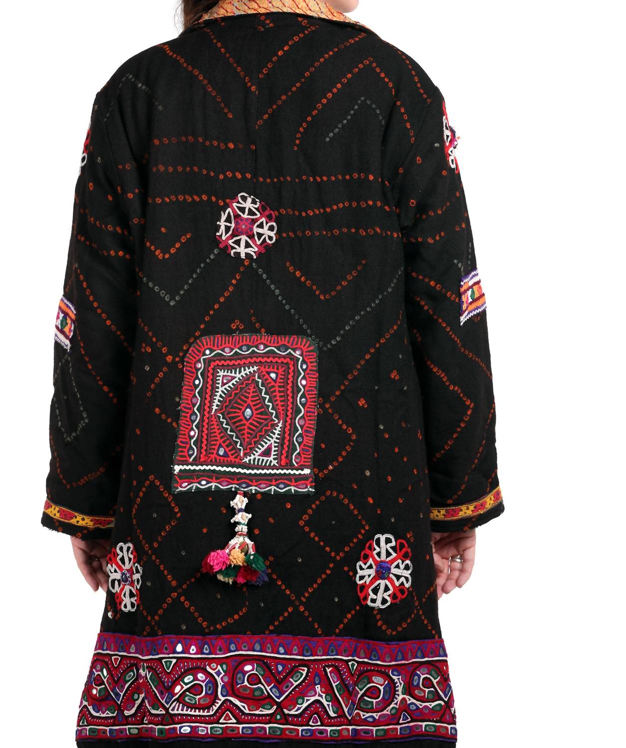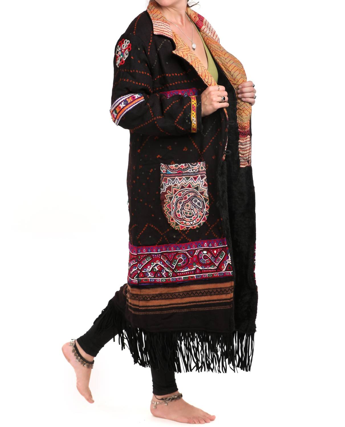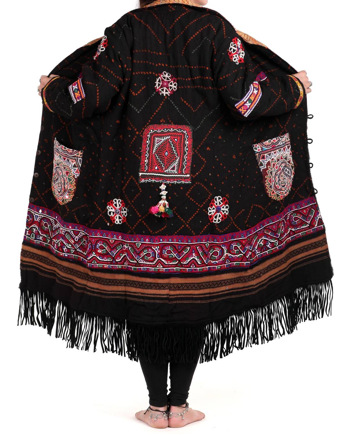 A jacket so versatile you can literally wear it with anything. Introducing StandAwt's Rare Merino Wool Coat in striking black and purple, a must-have for your winter wardrobe. This long-sleeve, patterned piece is meticulously crafted from 100% merino wool, featuring a faux fur lining for incredible warmth and comfort. The coat, standing 47 inches long with fringe, is further enhanced by a silk collar and unique hand-embroidered patches. Designed with practicality in mind, it offers SA Signature Patch Pockets, a secret pocket, and a button closure for versatile wear. Care for it by hand washing and laying flat to dry, ensuring its longevity.