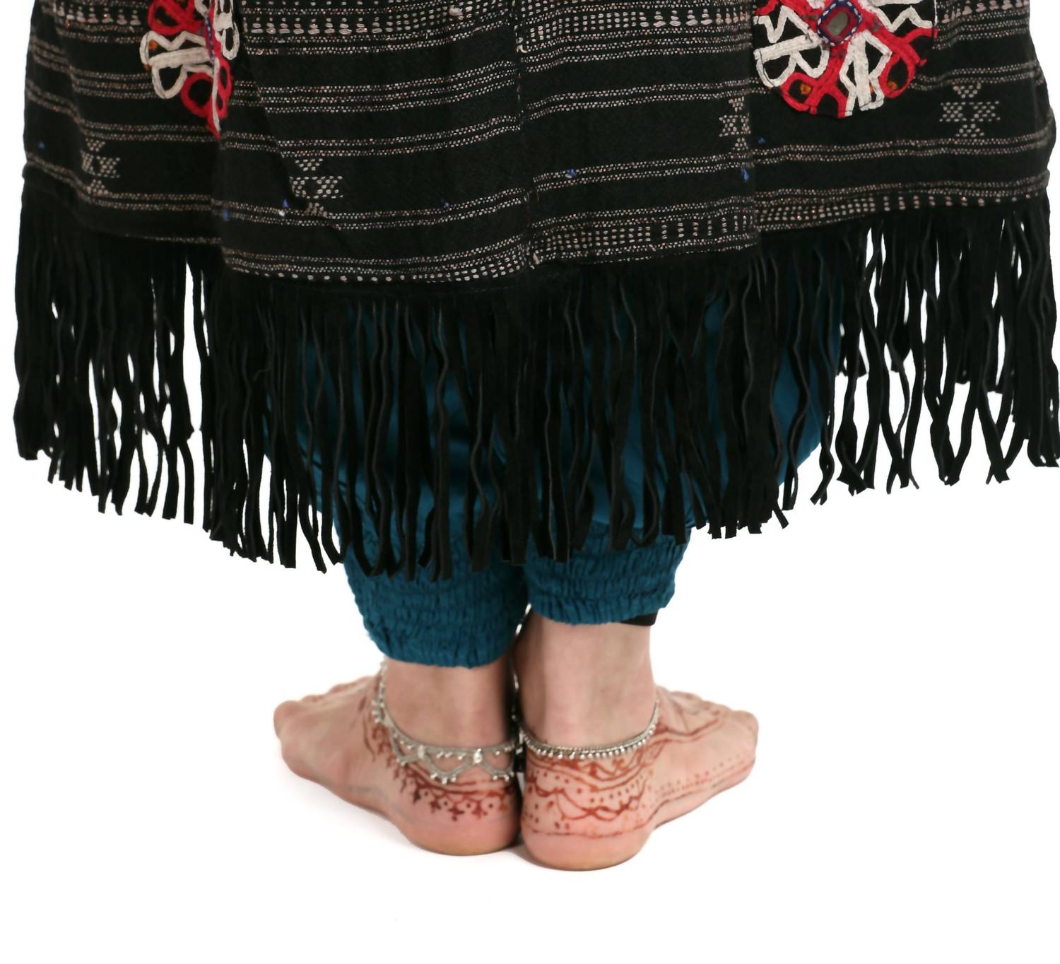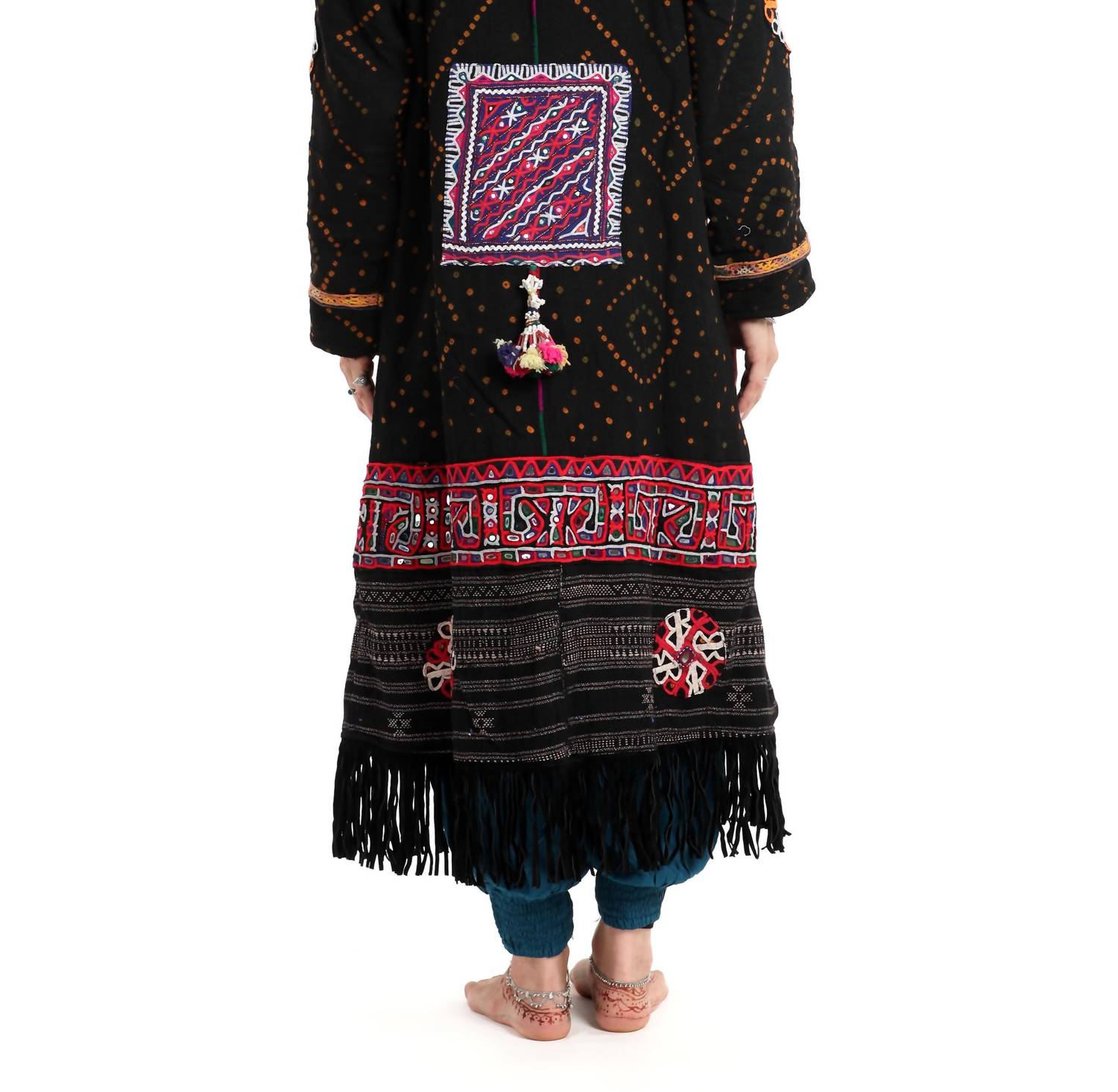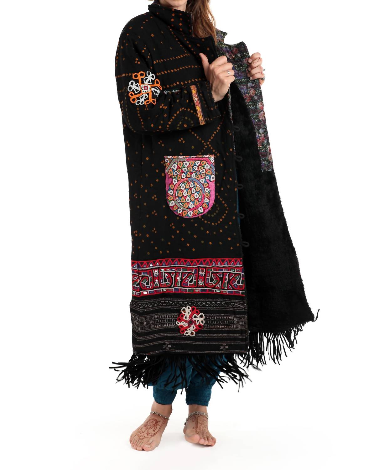 A casual yet cool jacket that every closset needs. Step into the spotlight with StandAwt's Rare Merino Wool Coat, a boho chic masterpiece crafted for the bold at heart. This long sleeve, patterned jacket is composed of 100% merino wool, decorated with hand-embroidered patches, a silk collar, leather fringe, and tassels, all in a striking black/orange/purple palette. Originating from the intersection of artistry and fashion, it features versatile button closure and hidden pockets for convenience, lined in faux fur for fall warmth. Care: Hand wash, and lay flat to dry to preserve its rich texture and vibrant hue.