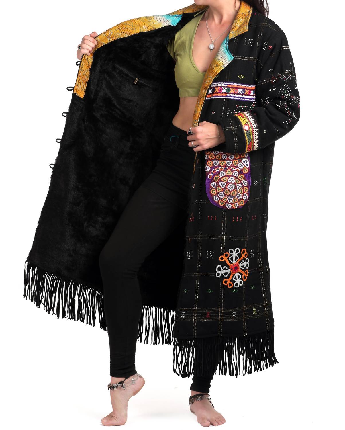 A casual yet cool jacket that every closset needs. Introducing StandAwt's Rare Merino Wool Coat, a boho-chic statement piece in striking black, yellow, and purple with a patterned finish. This unique coat features long sleeves and is expertly crafted from rare 100% merino wool, accented with hand-embroidered patches, a silk collar, and leather fringe. Designed for versatility, it includes a reversible button closure, faux fur lining for extra warmth, and ample storage with signature patch pockets and a secret inner pocket. Care: Hand wash and lay flat to dry.
