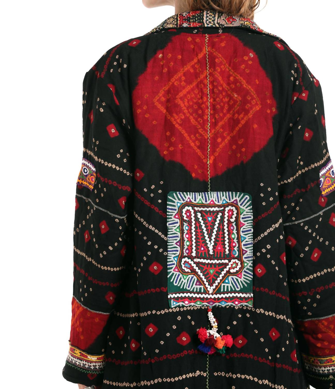 A casual yet cool jacket that every closset needs. Introducing the StandAwt Signature Kimono Coat, a statement piece designed for those who seek uniqueness and style. This long-sleeve wonder is crafted from a mix of merino wool and cotton, with a luxurious faux fur lining, ensuring warmth and comfort. The reversible design in a striking black, red, and green pattern features a signature silk collar, leather fringe, and intricate hand-embroidered patches. Closure is via buttons, complete with ample pocket space, including a secret compartment, and it's fully sustainable. Care: Hand wash and lay flat to dry.