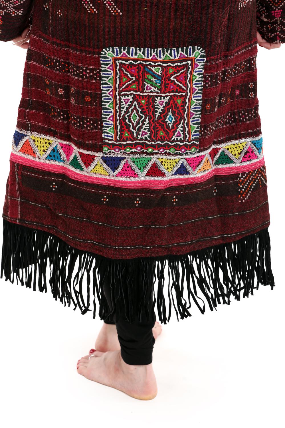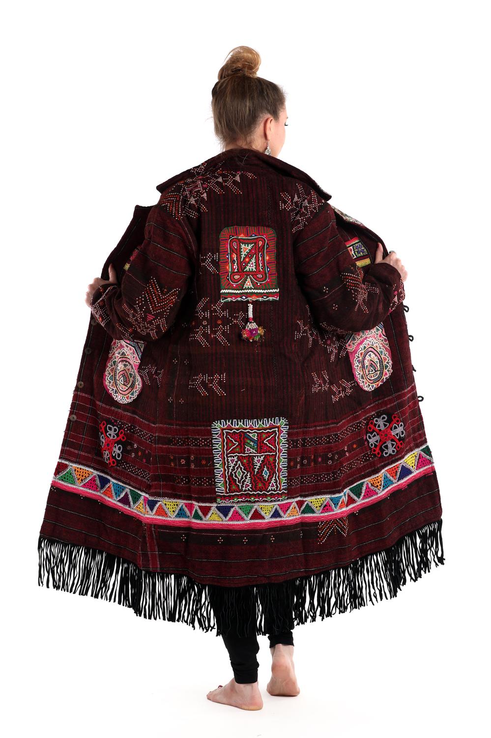 Introducing the StandAwt Rare Merino Wool Coat, a statement-making piece designed for those who cherish uniqueness and style. This maroon and pink patterned coat features long sleeves and is crafted from 100% eco-friendly merino wool, boasting a cozy faux fur lining for added warmth. Hand-embroidered patches, silk collar, and leather fringes add intricate details to its boho chic aesthetic. With a button closure and practical pockets, this reversible design ensures versatility, while care instructions recommend hand washing and laying flat to dry.