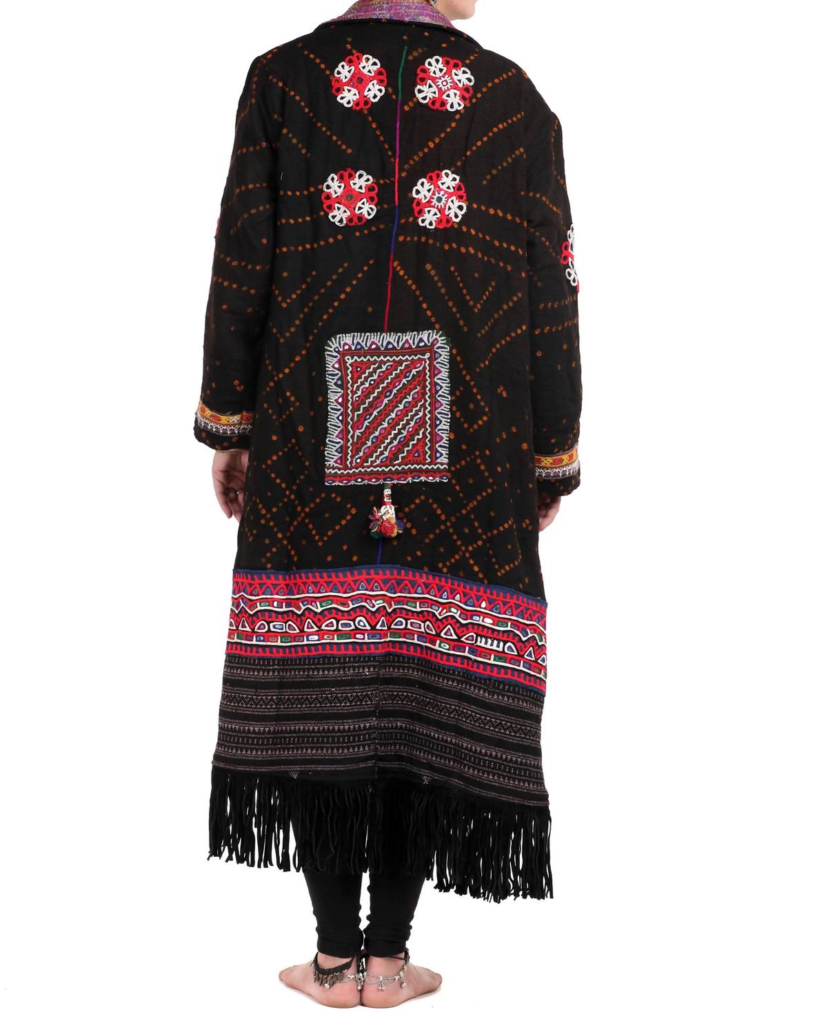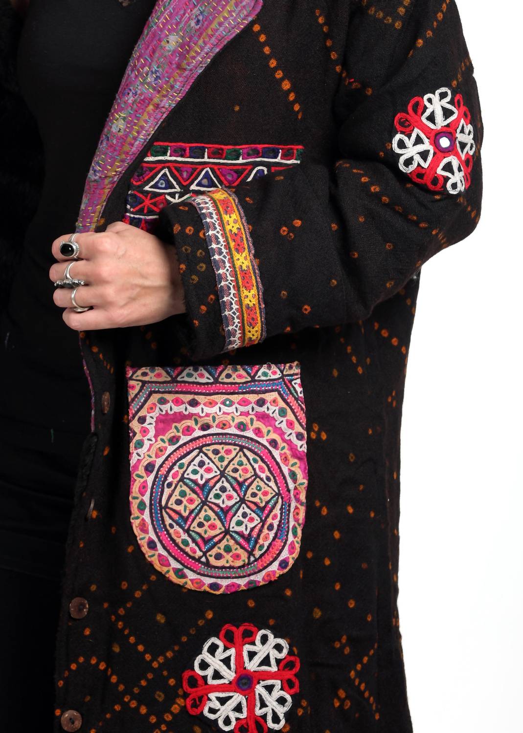 Cute, casual, and comfortable. This jacket is a must have. Introducing StandAwt's Rare Merino Wool Coat, a distinctive casual jacket designed for those who appreciate a statement piece. This long-sleeved coat, crafted from sustainably sourced merino wool and a cozy faux fur lining, features a striking black, purple, and pink pattern. Closure: Button closure. Care: Hand wash and lay flat to dry. Designed with pockets including a secret pocket, a silk collar, hand-embroidered patches, and leather fringes, this coat promises warmth and style for winter festivals or any boho chic occasion.