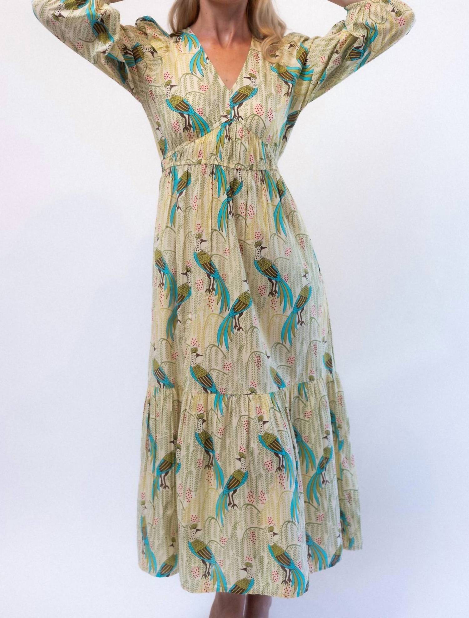 This dress features a striking peacock print with a flattering V-neck and full-length design. It boasts a tiered skirt and 3/4 length puff sleeves, made from 100% cotton poplin for comfort and breathability. Machine wash; tumble dry low or hang to dry.