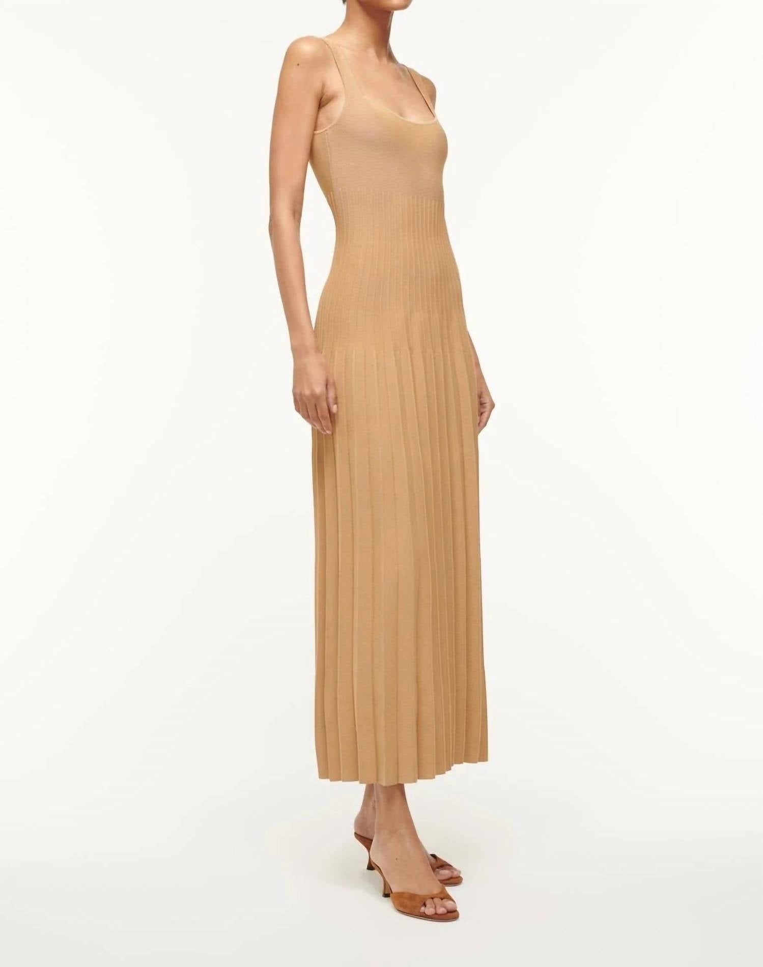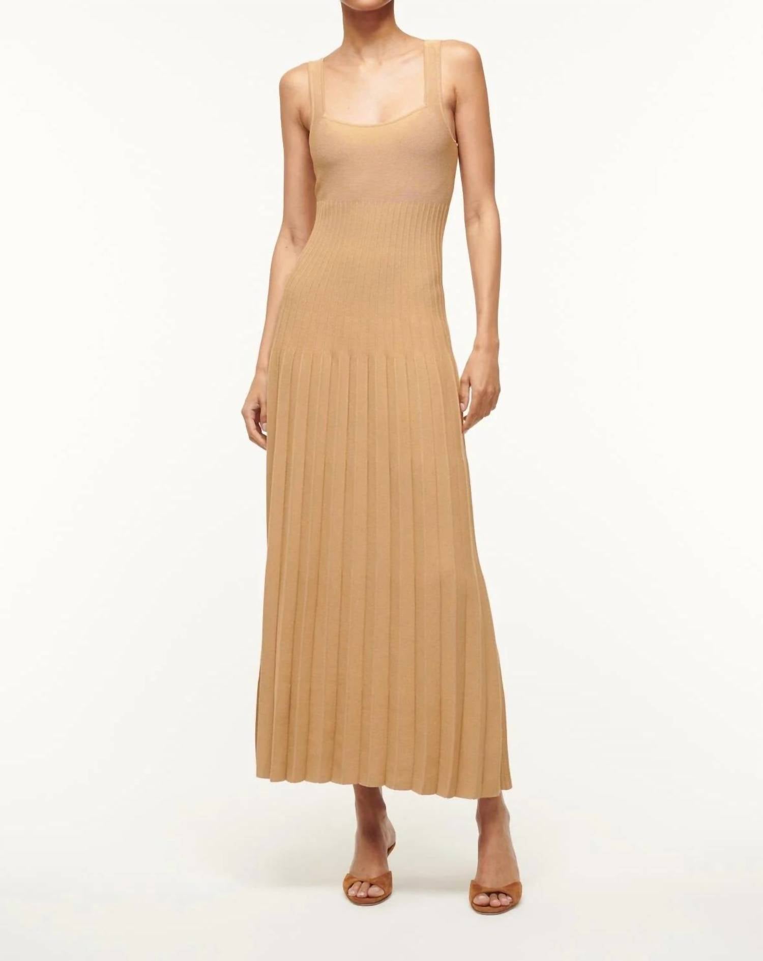 The perfect length dress does exist. Introducing the Ellison Dress by STAUD, a sophisticated camel midi designed for the modern woman. This sleeveless dress boasts a trendy square neckline and flattering ottoman stitch detailing at the waist, seamlessly combining style with comfort. Crafted from a luxurious blend of 59% Viscose, 40% Nylon, and 1% Spandex, this A-line silhouette features a convenient pull-on closure. Ideal for the minimalist, it's perfect for summer occasions like Easter or a dinner party, offering a timeless, bra-friendly fit.