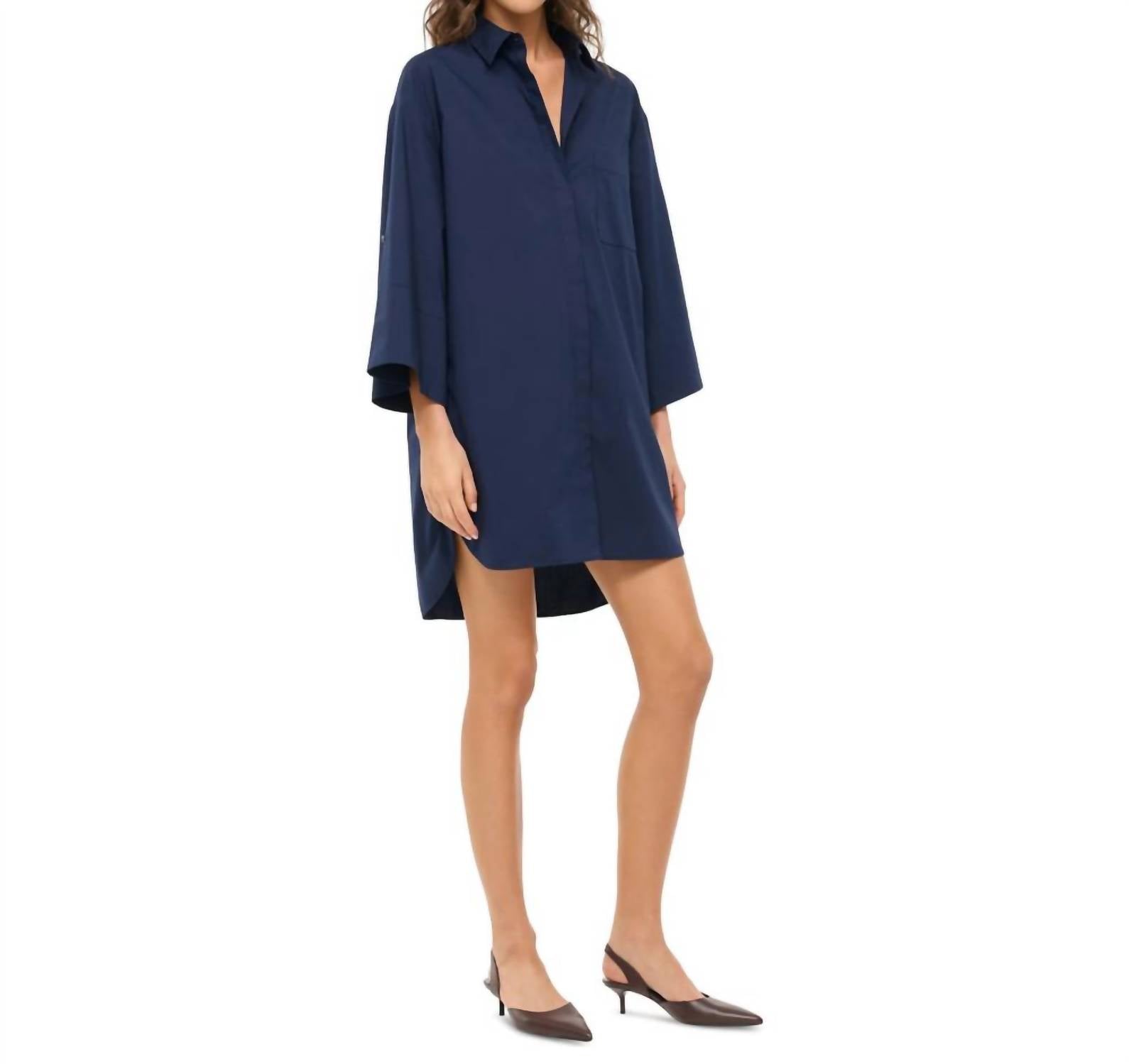 Introducing the Nico Dress by STAUD, a minimalist navy mini shirtdress perfect for those summer holiday parties. This shift dress features three-quarter length adjustable sleeves and a chic shirttail hem, crafted from our signature cotton poplin fabric. Composition: 98% Cotton, 2% Spandex. Closure: Button closure. Care: Dry clean only. Model is 5'9" and wearing a size S.