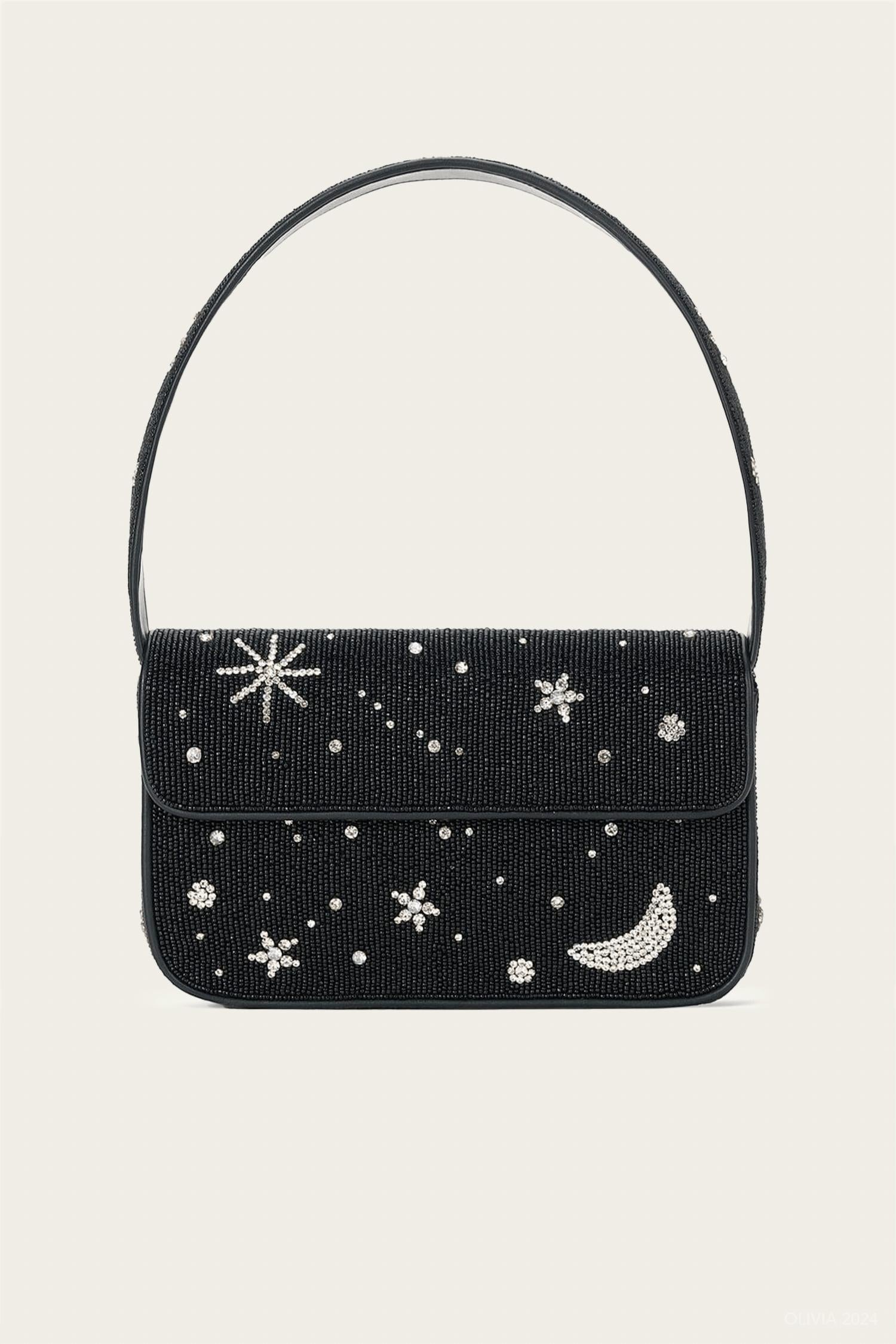 Step into elegance with the Tommy Beaded Bag by STAUD, a shimmering statement accessory in the enchanting shade of Starry Night. Meticulously crafted, it features self-100% glass beads, a durable 100% rayon base, and chic 100% vegan leather trim. Measuring 10 inches by 2 inches by 6 inches, this imported beauty is perfect for evening outings or adding sparkle to your everyday look.