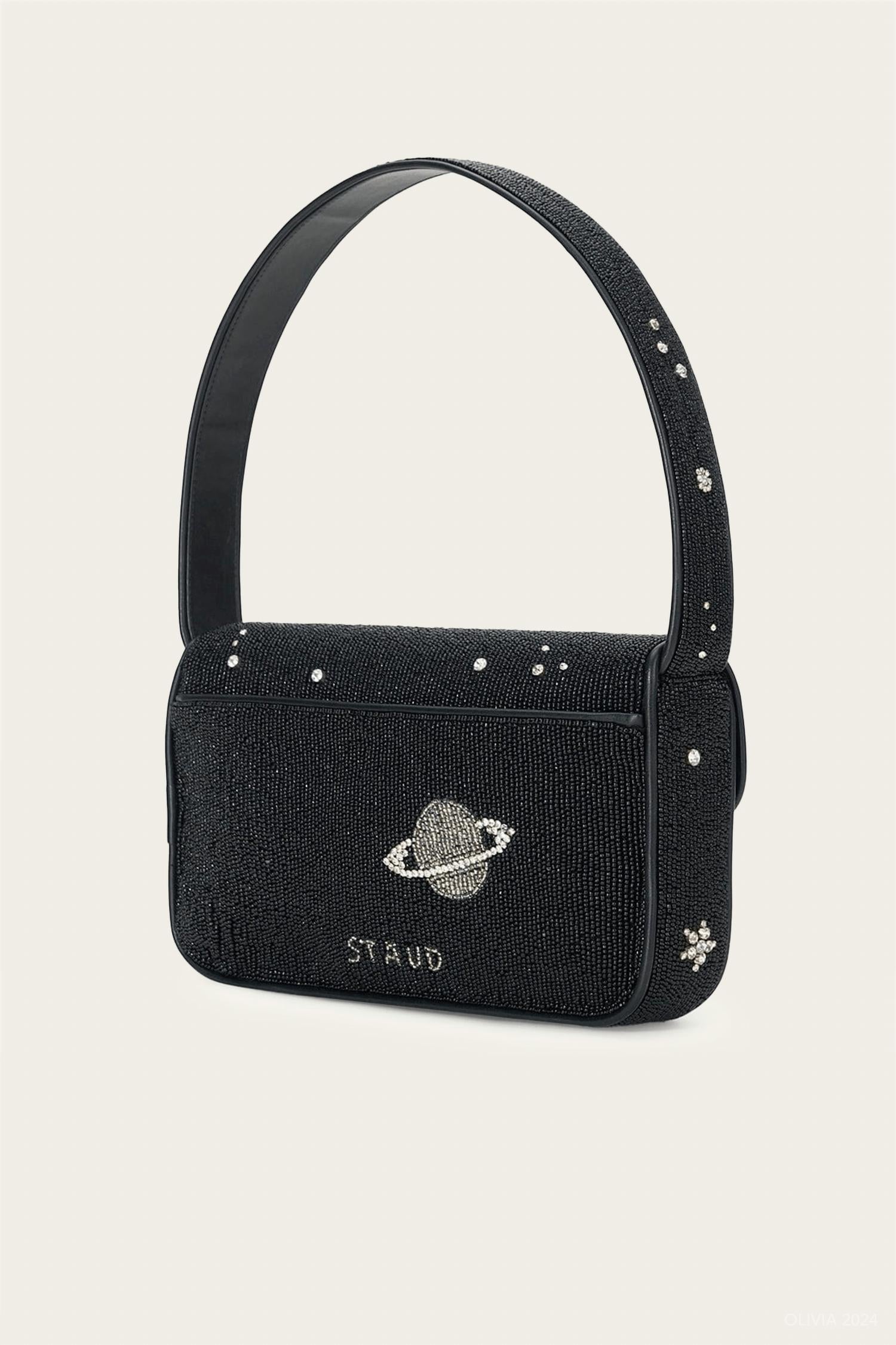 Cute and casual, this hobo bag is a fan favorite. Step into elegance with the Tommy Beaded Bag by STAUD, a shimmering statement accessory in the enchanting shade of Starry Night. Meticulously crafted, it features self-100% glass beads, a durable 100% rayon base, and chic 100% vegan leather trim. Measuring 10 inches by 2 inches by 6 inches, this imported beauty is perfect for evening outings or adding sparkle to your everyday look.