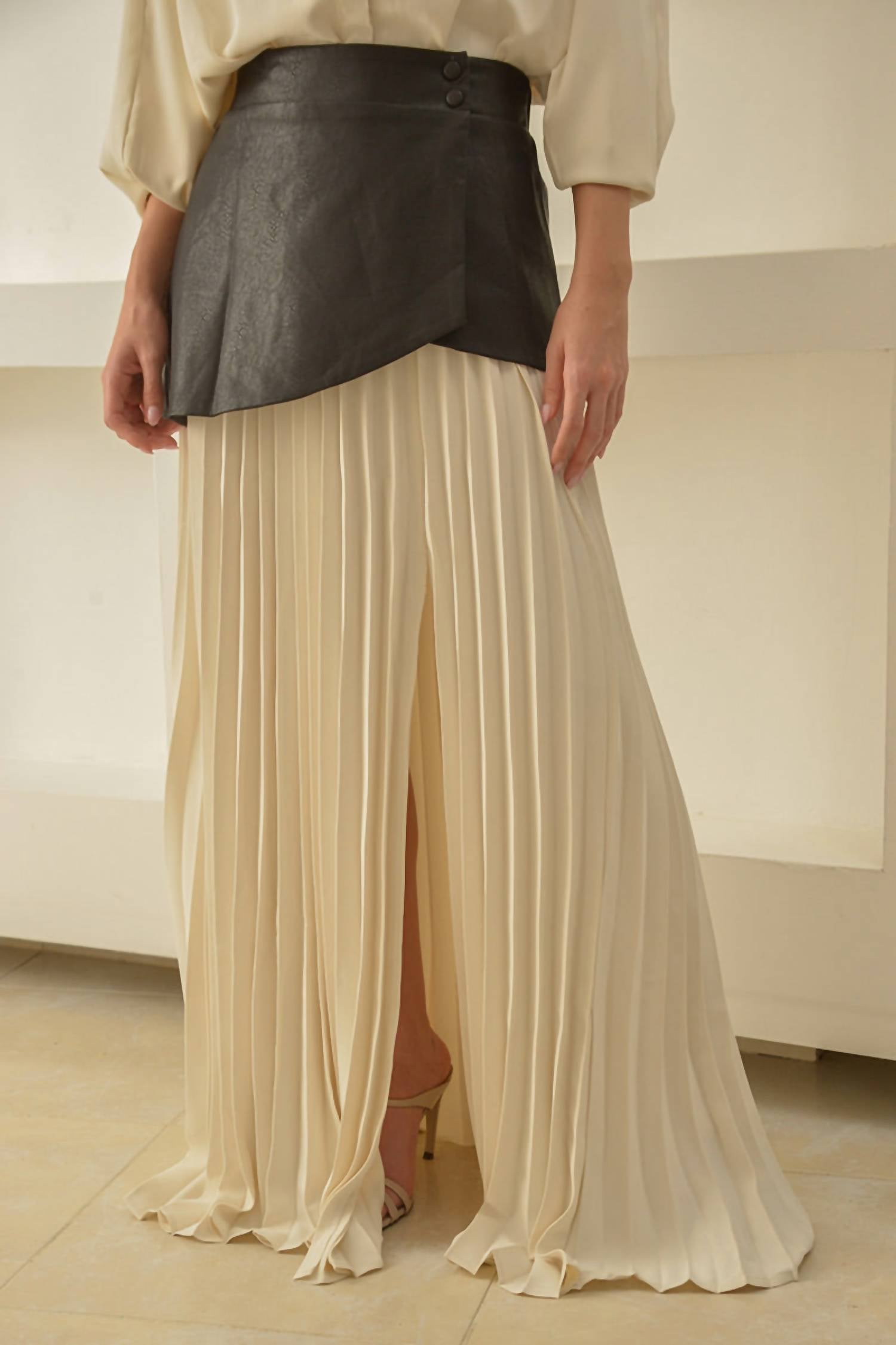 Loungewear doesn't have to be frumpy and this is exactly what we had in mind. Designed for a comfortable fit, this chic little number will be your favorite lounging-at-home look. Introducing the Camelia High Fashion Set by Steffany Milano, a loungewear ensemble that captures quiet luxury and urban elegance. This beige set features a collar neckline and long sleeves, making it ideal for a stylish dinner party or New Year's Eve celebration. Crafted with a composition of 60% Polyester, 30% Rayon, and 10% PU Faux Leather, it includes a pleated maxi skirt and an oversized silky blouse, topped off with a bold faux leather belt. Designed for women who embrace a solid pattern and architecturally inspired style, this outfit effortlessly embodies a shift dress silhouette, perfect for the fall season.