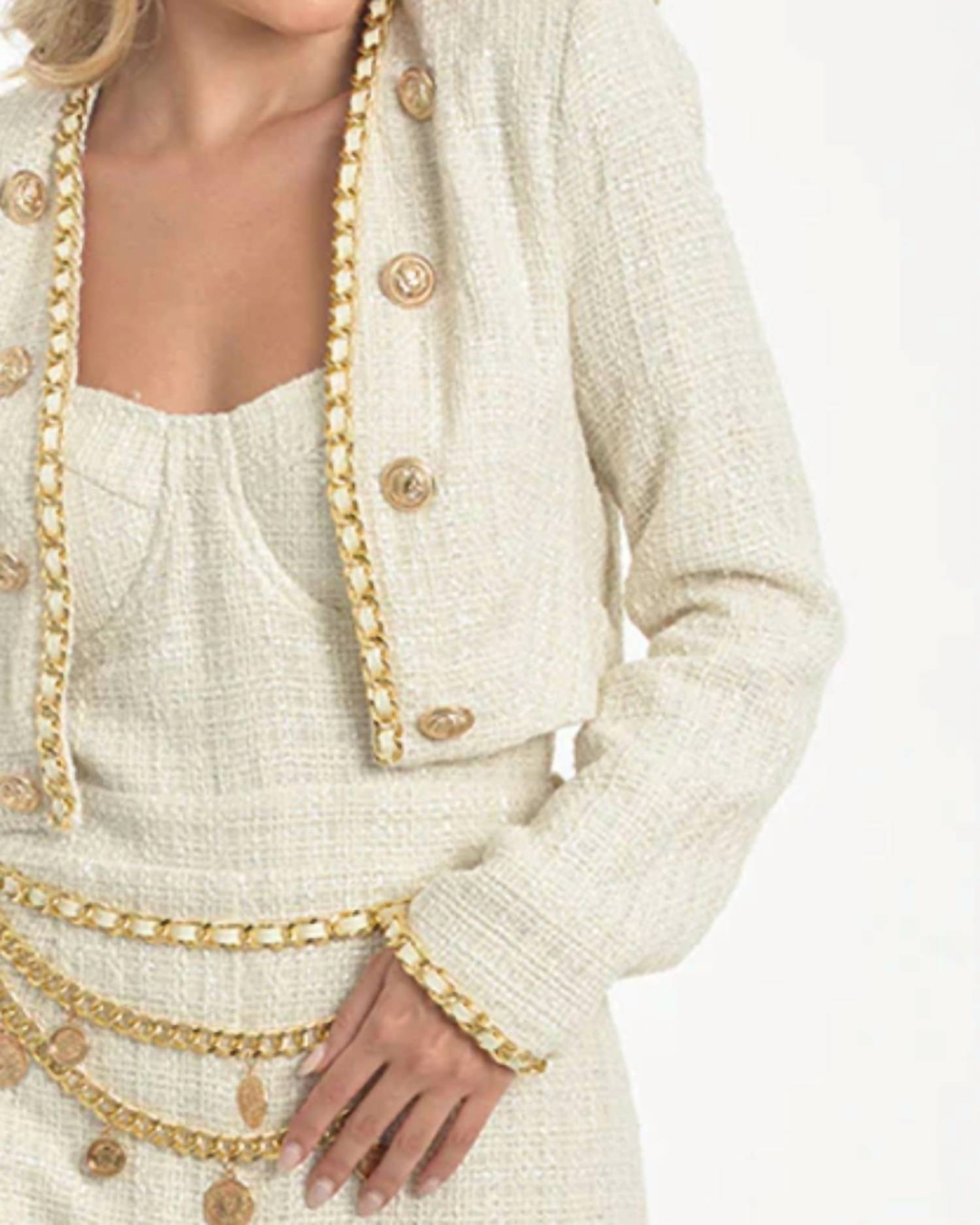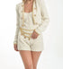 Discover the intricate charm of the Floral Bra Top and Trousers set by Steffany Milano. This loungewear set, designed for women, features a sweetheart neckline and elegant long sleeves, seamlessly blending femininity with sophistication. Crafted from 100% textured nylon in a delicate beige floral pattern, it's the epitome of quiet luxury. Perfect for a summer dinner party, this stylish ensemble promises to elevate your New Year's Eve look.