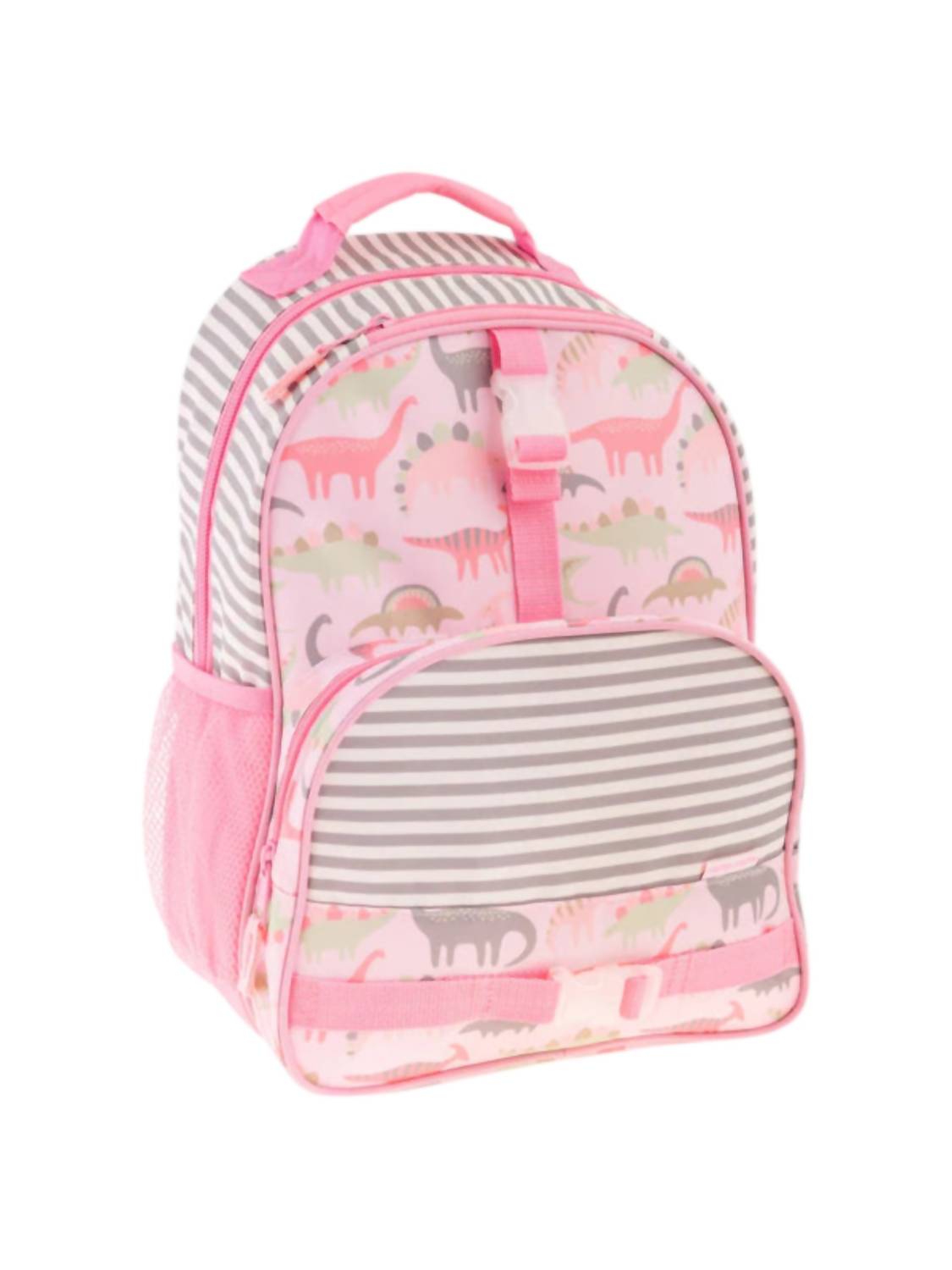 Introducing the Kid's All Over Print Backpack by Stephen Joseph, combining fun and functionality for school-age kids. Made from durable polyester, it has padded adjustable shoulder straps and two mesh side pockets for water bottles, along with three spacious compartments. Measuring about 12" x 6.5" x 16" (30.48cm x 16.51cm x 40.64cm), it holds school essentials and playtime clothes. Easy to clean with a damp cloth.