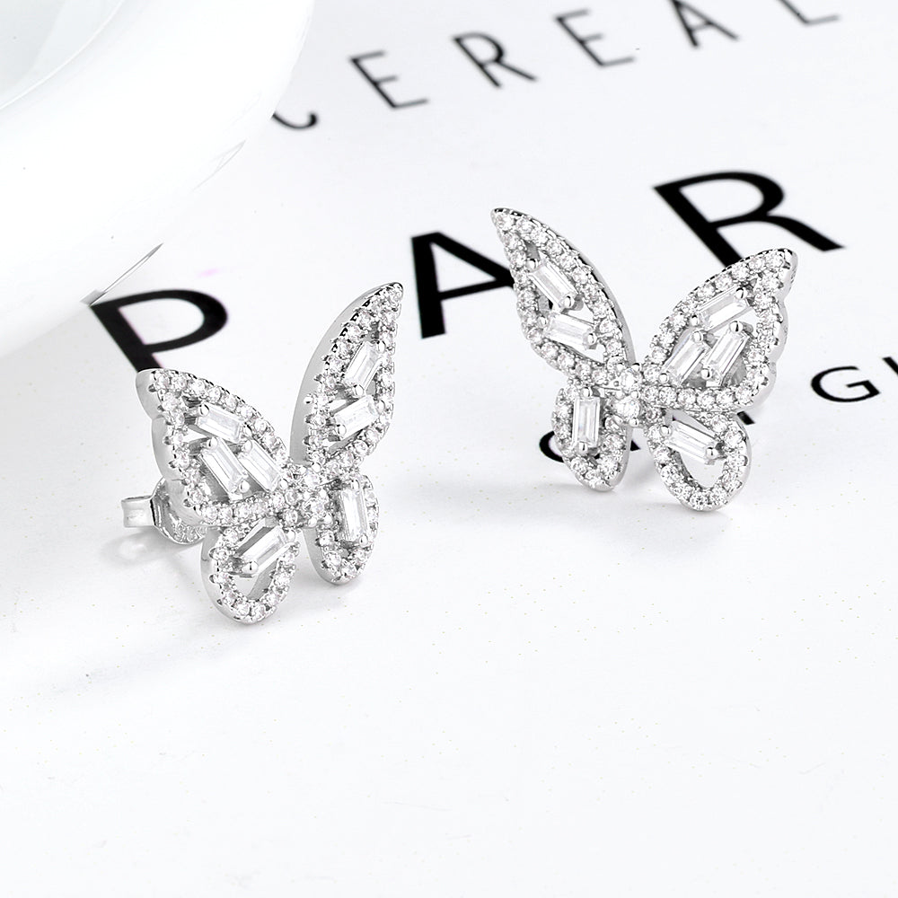 Add a touch of whimsy to your look with this Round and Baguette Butterfly Earrings with Crystals. Made with lead- and nickel-free crystals, Hypoallergenic Silver and High Polished finish. This Sterling Silver Round and Baguette Butterfly Earrings with Crystals is the perfect gift for a bride, bridesmaid or wedding party member. The earring features a sterling silver butterfly with Swarovski crystals. This look is adorned with an elegant high polished finish and comes in a beautiful jewelry box that makes it the perfect gift.