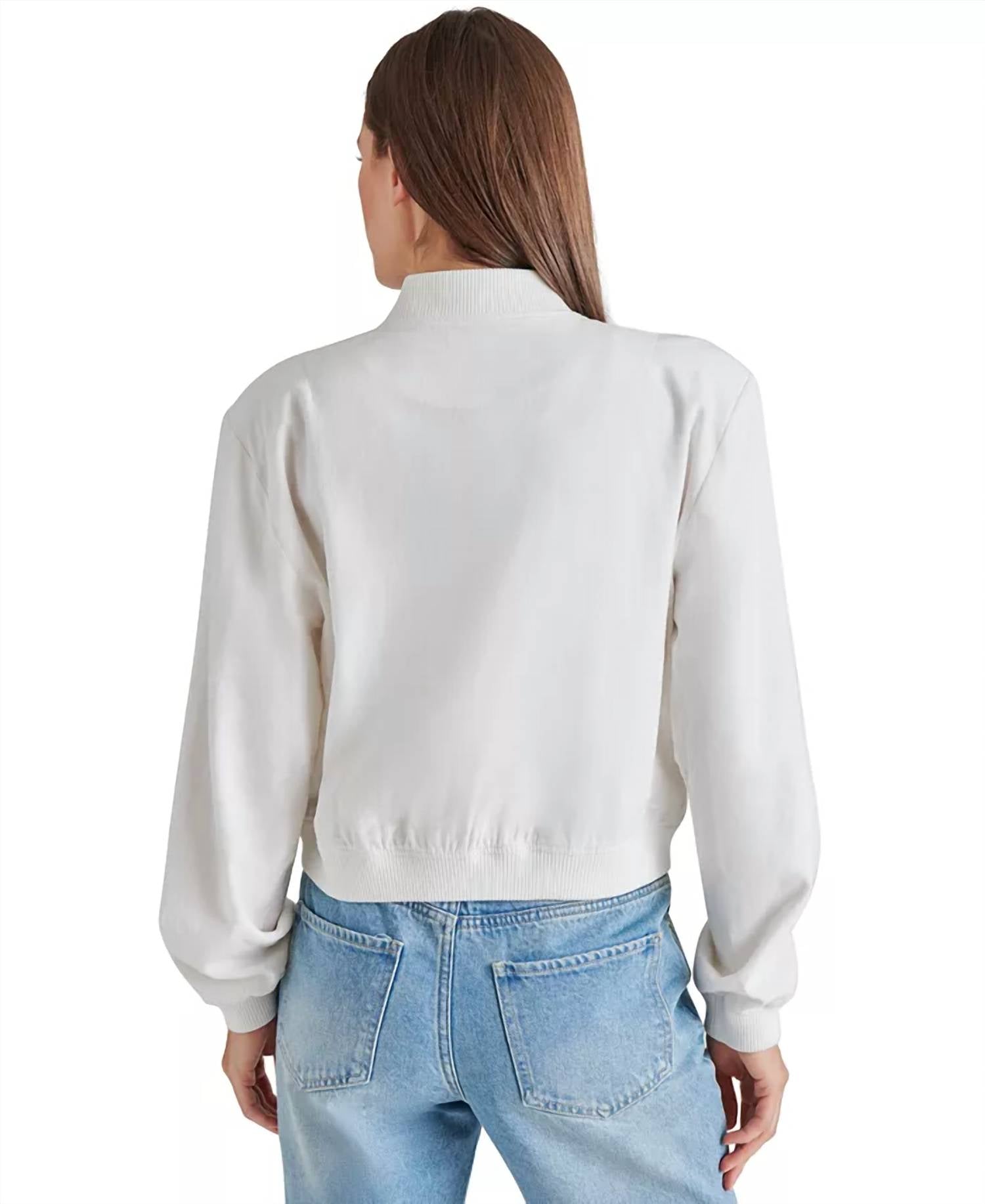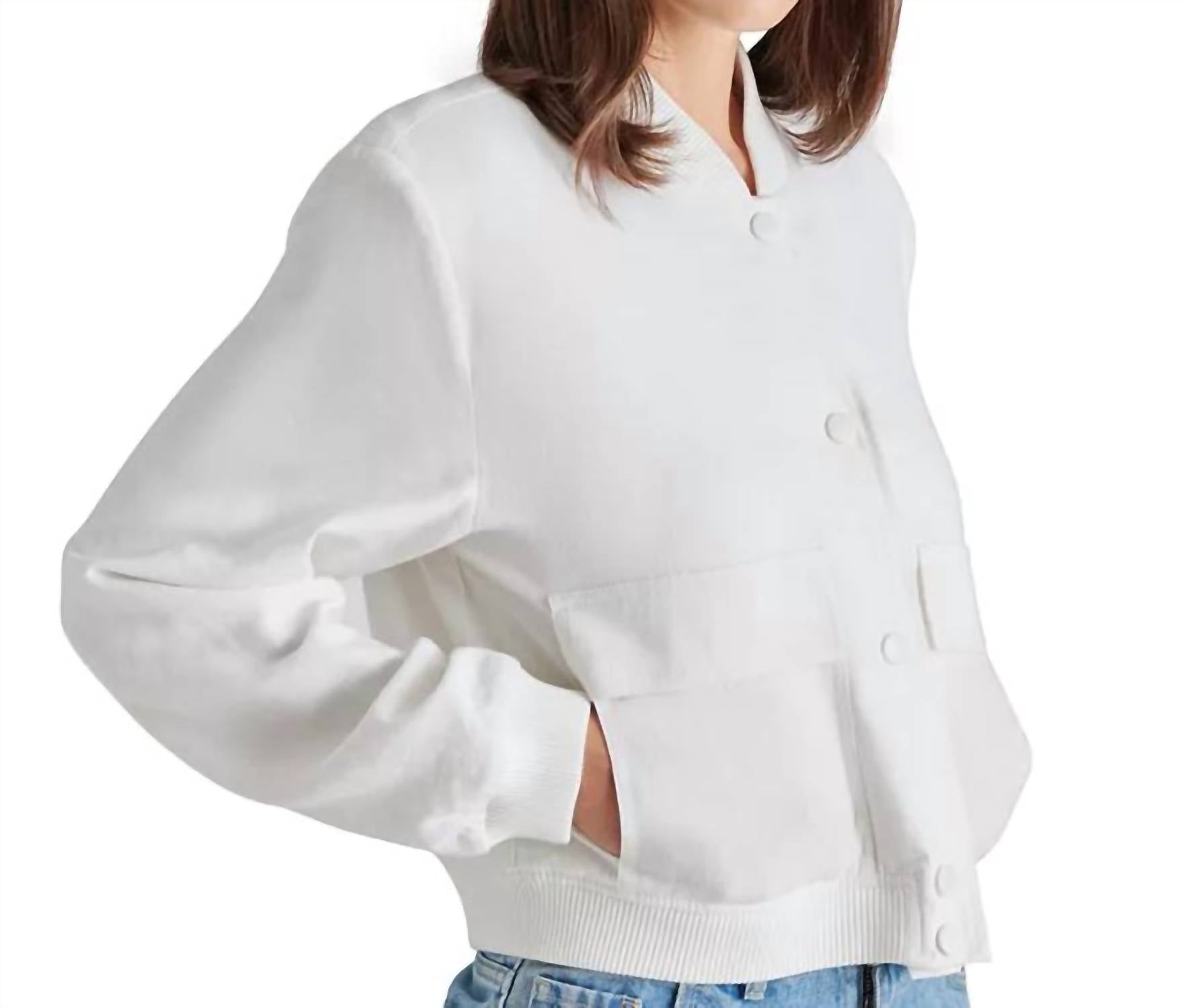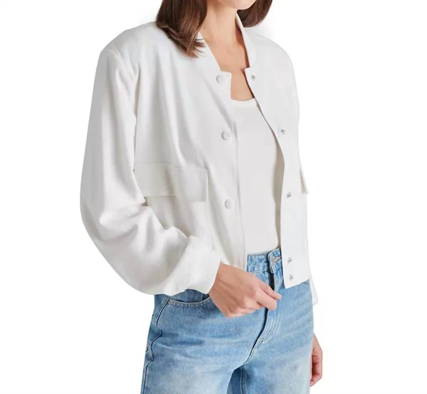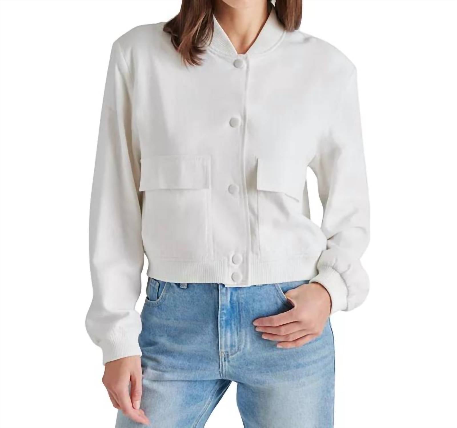 Nothing is cooler than this vintage inspired bomber jacket. Elevate your workwear wardrobe with the Ardine Linen-blend Bomber Jacket by Steve Madden, a sophisticated choice for any engagement event. This long sleeve jacket combines 55% linen and 45% rayon in a solid white, featuring a V-neck and practical pockets. Made with care, it's lined for comfort and secures with a button closure. For easy maintenance, simply machine wash as needed.