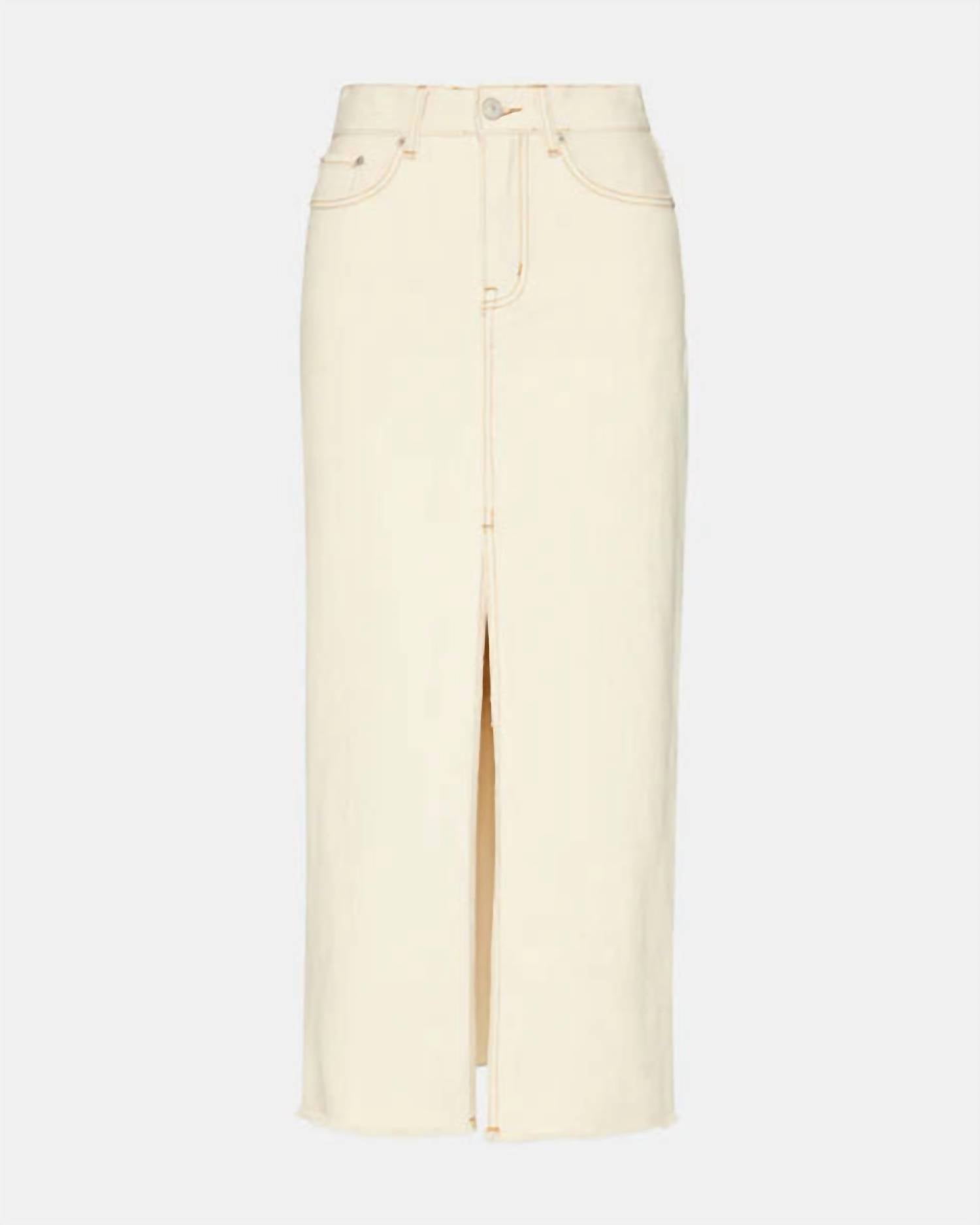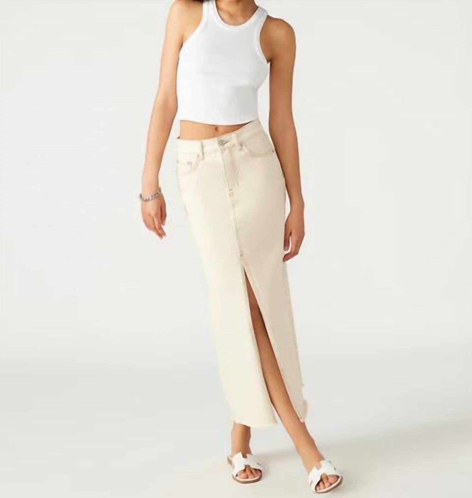 Embrace chic elegance with the STEVE MADDEN Avani Denim Skirt in a sophisticated cream shade. This women's maxi skirt, measuring 35.25" in length, is crafted from 100% cotton denim, offering both comfort and style. Featuring a zipper fly closure, a distinctive front slit, and a raw hem, it adds an edgy touch to your ensemble. With functional front and back pockets, maintain practicality without sacrificing fashion-forward aesthetics. Care is made easy with machine wash cold and low tumble dry instructions, ensuring effortless maintenance.
