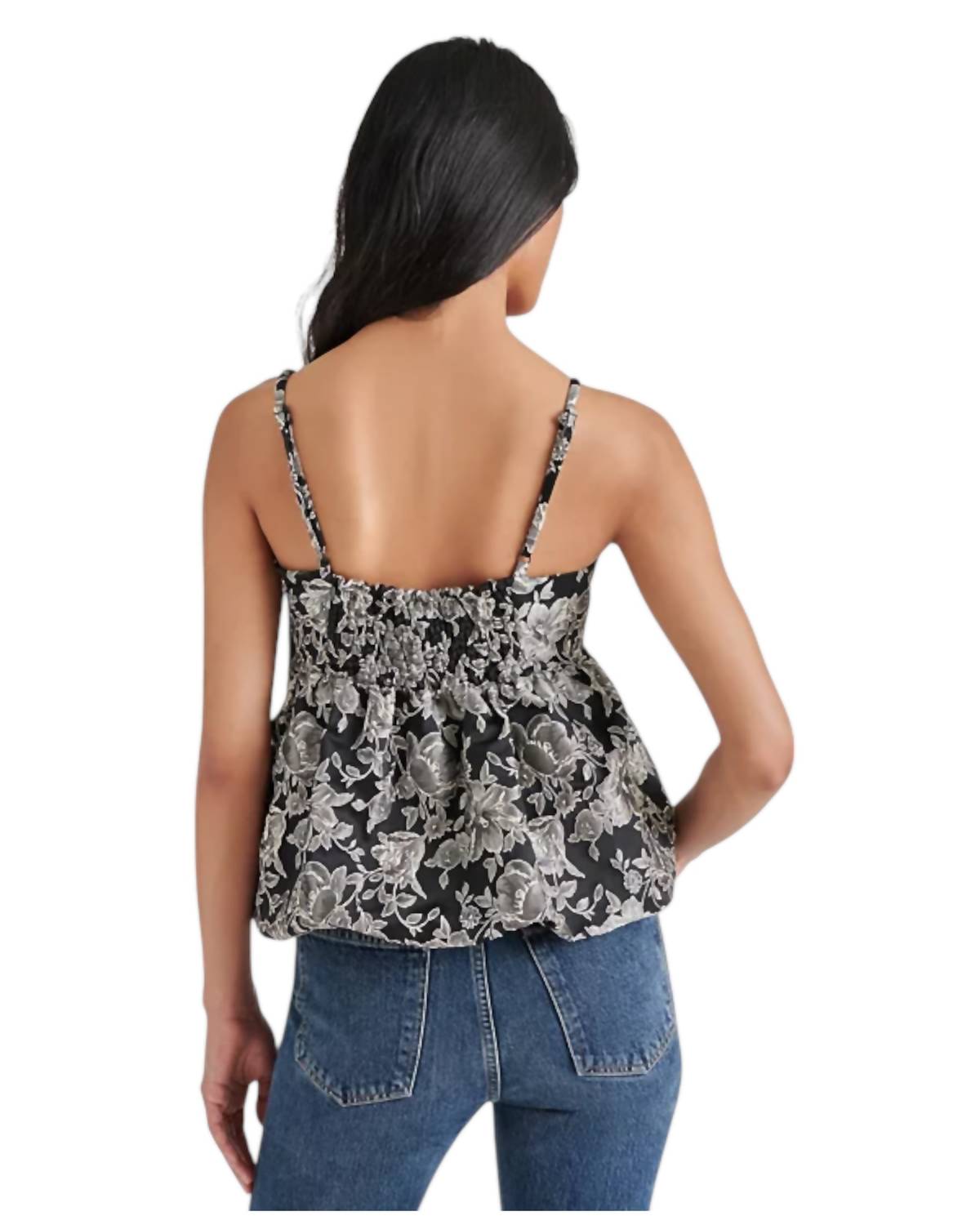 Fit, fabric and functionality. This tank top checks all the boxes. A chic tank top in elegant black with a stylish floral pattern. Featuring spaghetti straps and a trendy squareneck, this piece is crafted from premium polyester. Measuring 16 inches in length, the top offers a sleek and modern fit. Closure: Pull on. Care: Dry clean only.