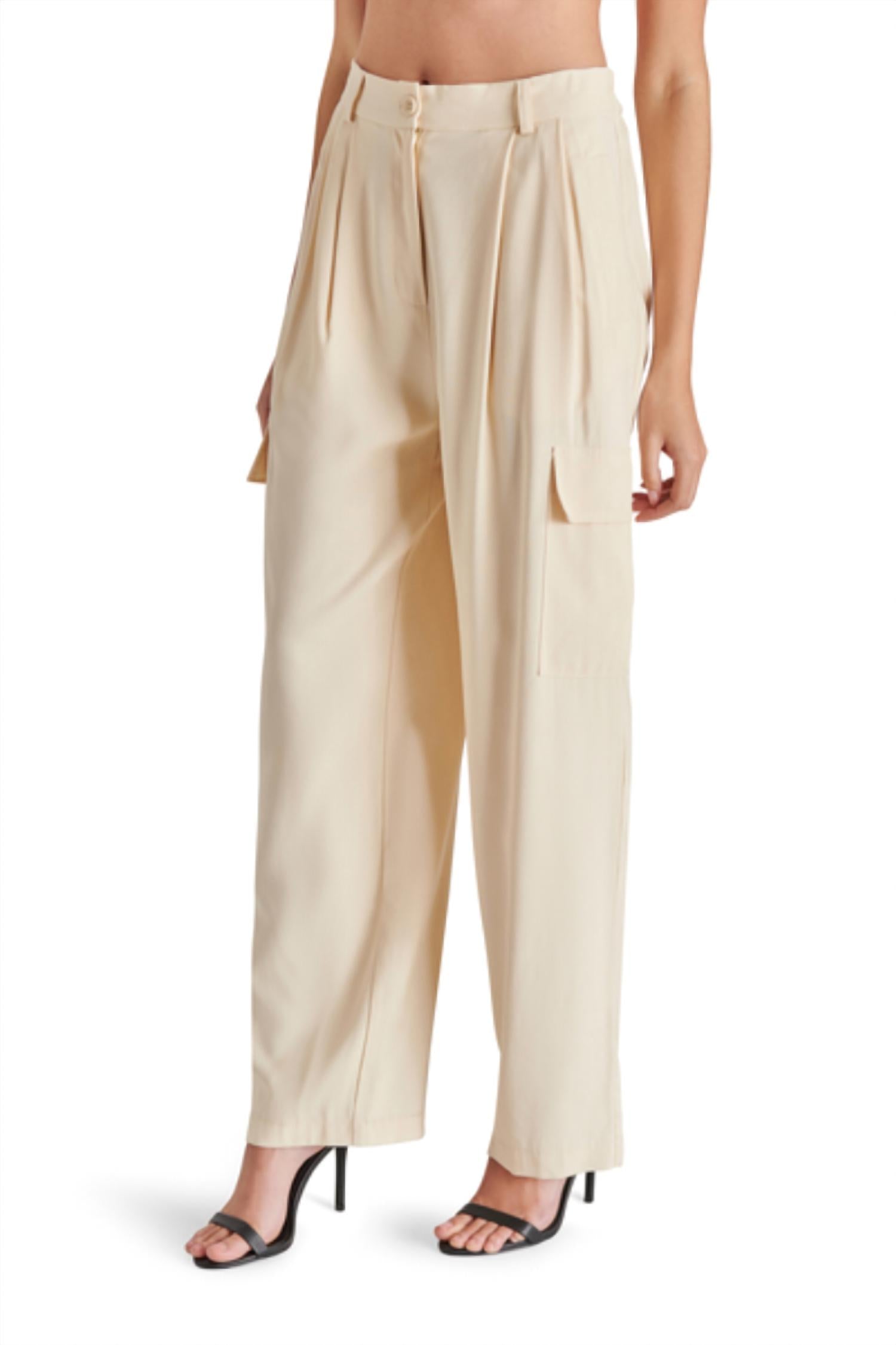Elevate your wardrobe with the Steve Madden Daya Pant, crafted from a soft, solid oatmeal rayon blend that combines 90% rayon and 10% polyester. These versatile wide-leg cargo trousers feature an inseam of 30 inches, complete with an elastic back and button closure for added comfort and style. With two functional side pockets and patch pockets, they bring practicality to chic design. Care for these stylish trousers by hand washing cold separately, laying flat to dry, and using a low iron if necessary.