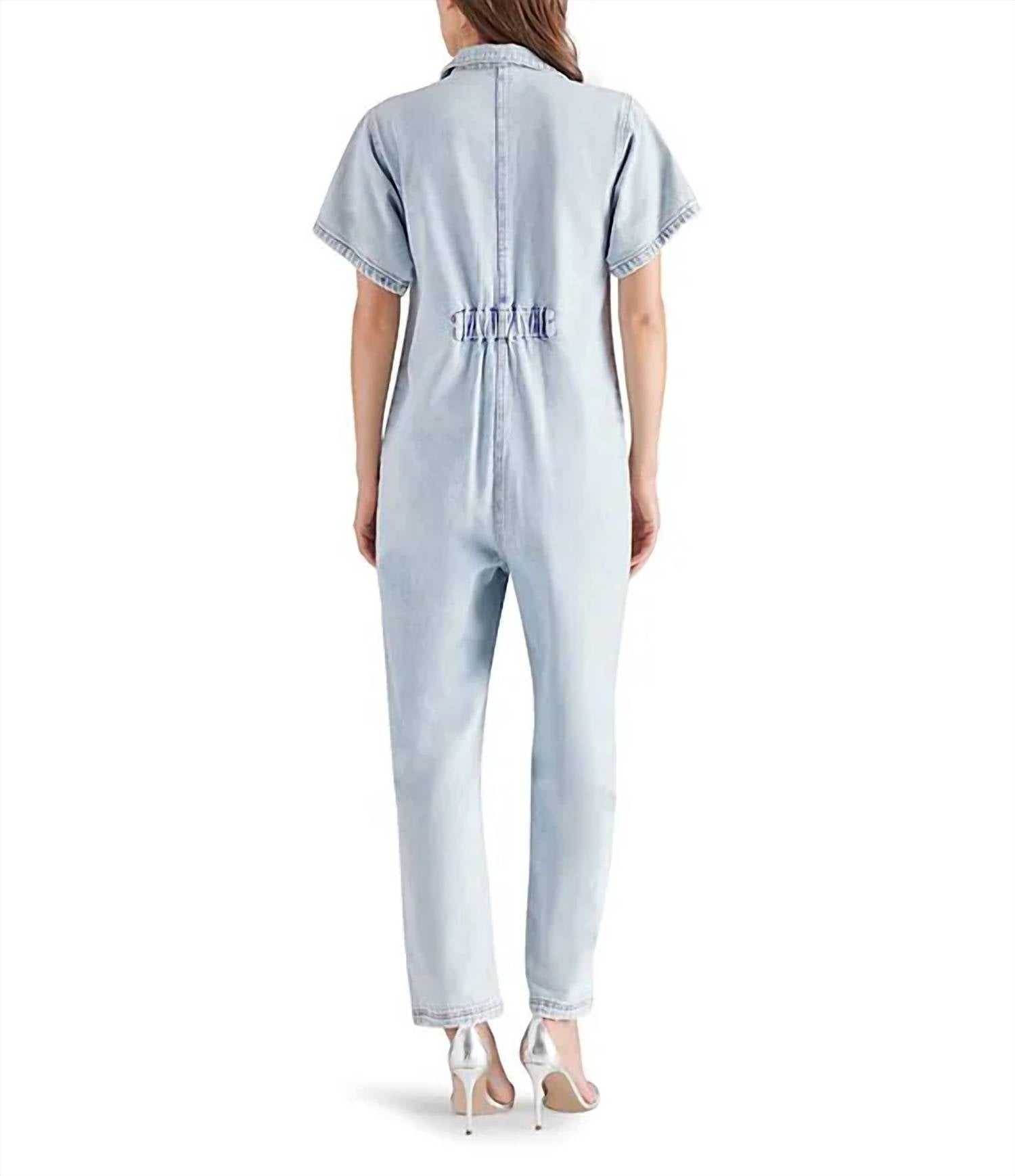 It doesn't take much for this one piece to look effortlessly cool. Add some statement jewelry to dress it up, or throw on some sneakers for a more casual vibe. Rock a modern casual-cool vibe in this stretch-kissed denim jumpsuit cut in a relaxed fit and shaped by a panel of elastic at the back. 28" inseam (size Small) Front zip closure Spread collar Short sleeves Front patch pockets 95% cotton, 4% polyester, 1% spandex Hand wash, dry flat Imported
