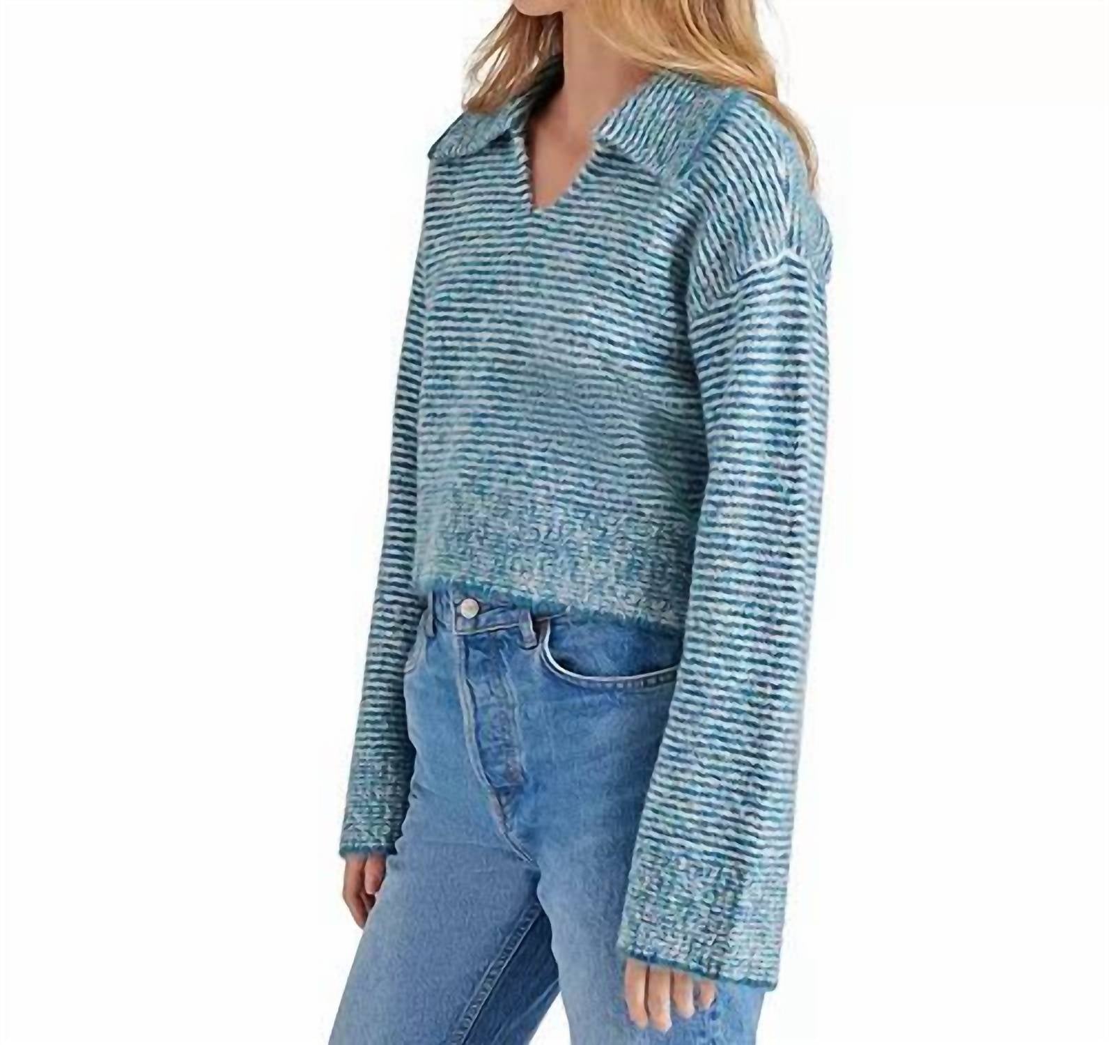 Cooler temps call for layering and we love this adorable sweatshirt for all the obvious reasons. Introducing the Esther Sweater by Steve Madden, a chic new take on a classic polo vibe that's perfect for cozy days. Designed with long sleeves, this sweater is made from a blend of 81% polyester, 7% acrylic, 7% nylon, and 5% wool, providing warmth and style in a teal and white striped pattern. Featuring a collared split neckline and cropped hem, it offers an elegant yet casual look. It's an imported piece with a convenient pull-on closure, and it's easy to care for with machine wash instructions.