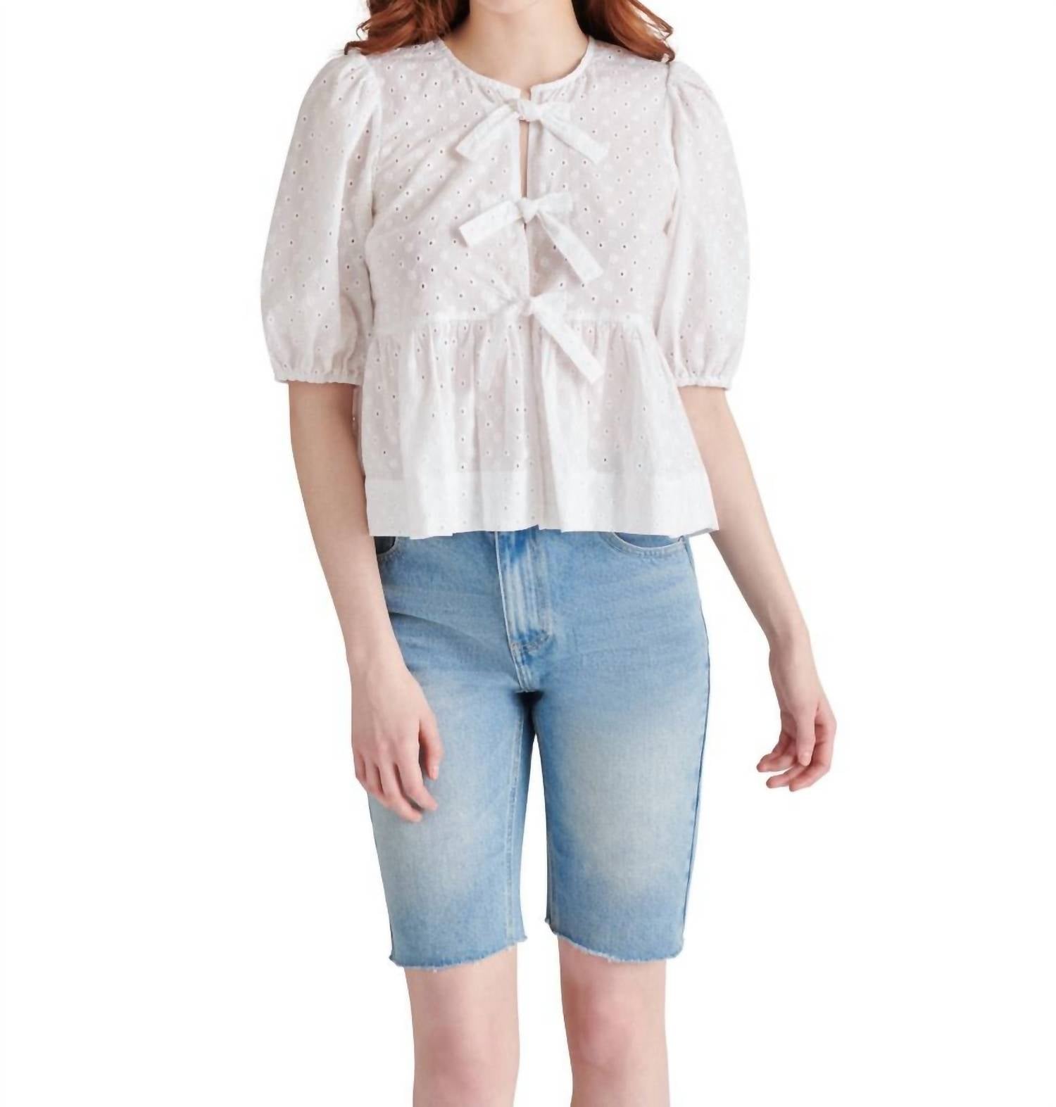 A timeless blouse that will never go out of style. Elevate your wardrobe with the Eyelet Tie Front Blouse by Steve Madden, a minimalist piece perfect for any engagement. This stylish top features elbow-length puff sleeves and a charming tie-front closure, accentuated by delicate eyelet details. Made from 100% cotton, it offers comfort and breathability while maintaining a chic, modern look. Care: Hand wash and lay flat to dry.