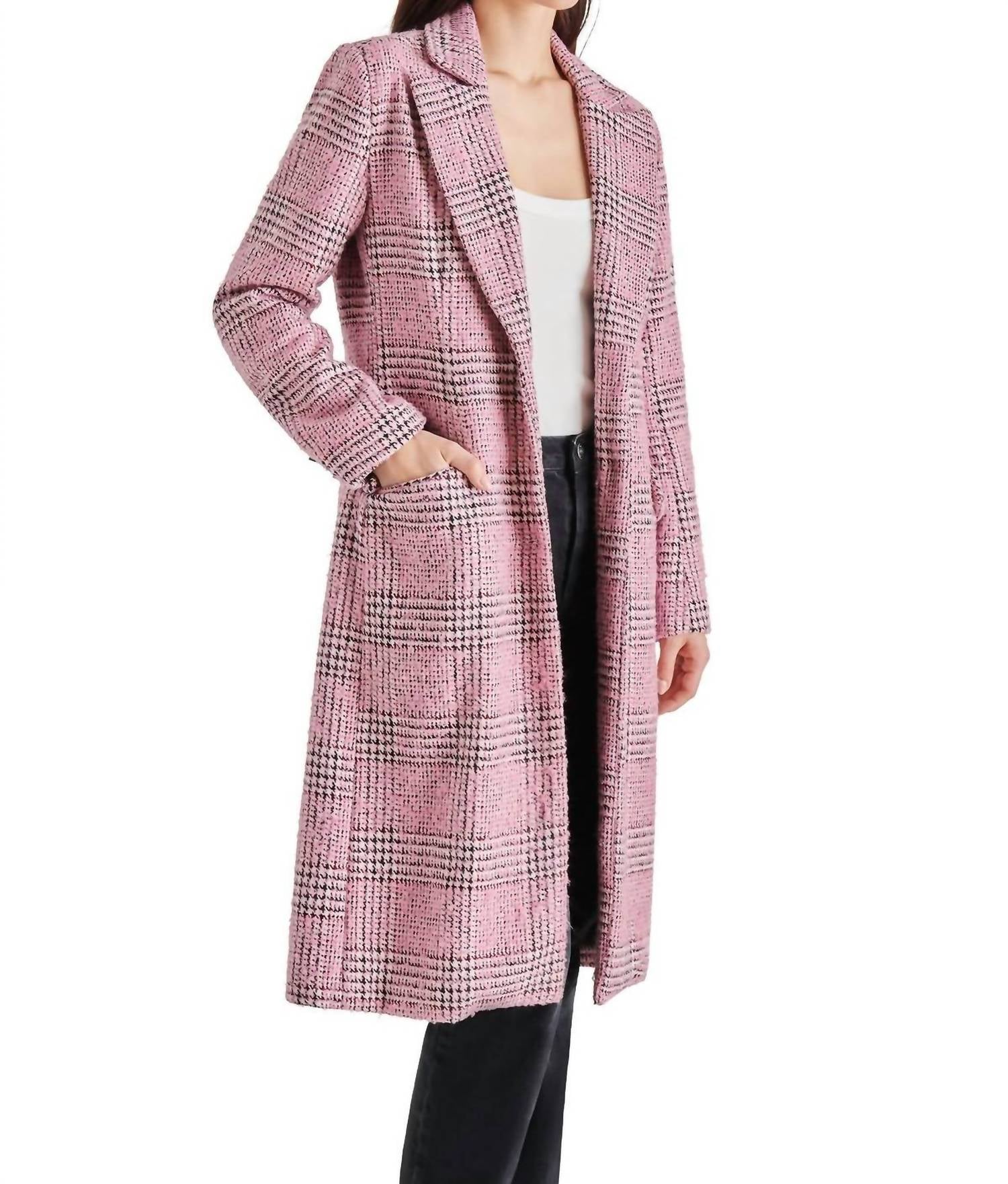 Step out in style with the Gemini Coat, designed to elevate your outerwear collection. This chic long checkered coat features a feminine pink check pattern for a modern twist on a classic design. Crafted from a blend of Polyester and Acrylic, this piece includes a button closure for secure wear. To maintain its pristine look, hand wash cold.