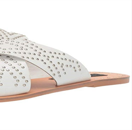 Studded crisscross straps boast a flash of geometric patterns in the understated slip-on design of STEVEN NEW YORK's Girlish sandals.| 1/2 heel| Round-toe slip-on crisscross sandals| Studded design at straps| Leather upper; manmade lining; rubber sole| Imported
