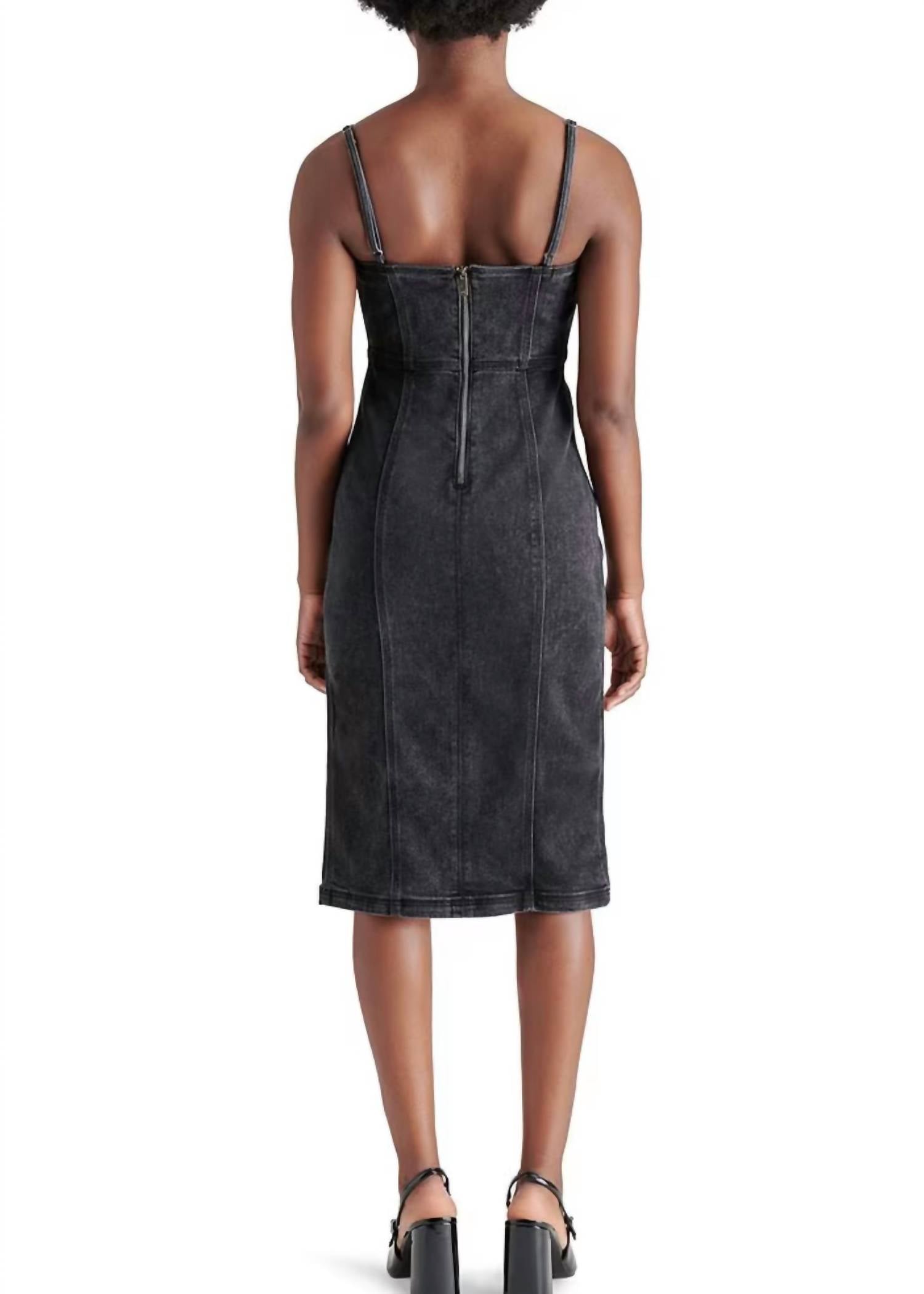 The perfect length dress does exist. Elevate your style with the Giselle Slit Midi Dress by Steve Madden, a bodycon silhouette crafted from high-quality denim in classic black. Featuring sleeveless design with adjustable straps and measuring 45" in length, this dress offers a perfect fit thanks to its exposed back zip closure. Composition: 95% Cotton, 4% Polyester, 1% Spandex. Care: Hand wash cold separately, do not bleach, lay flat to dry, low iron if necessary, or dry clean.