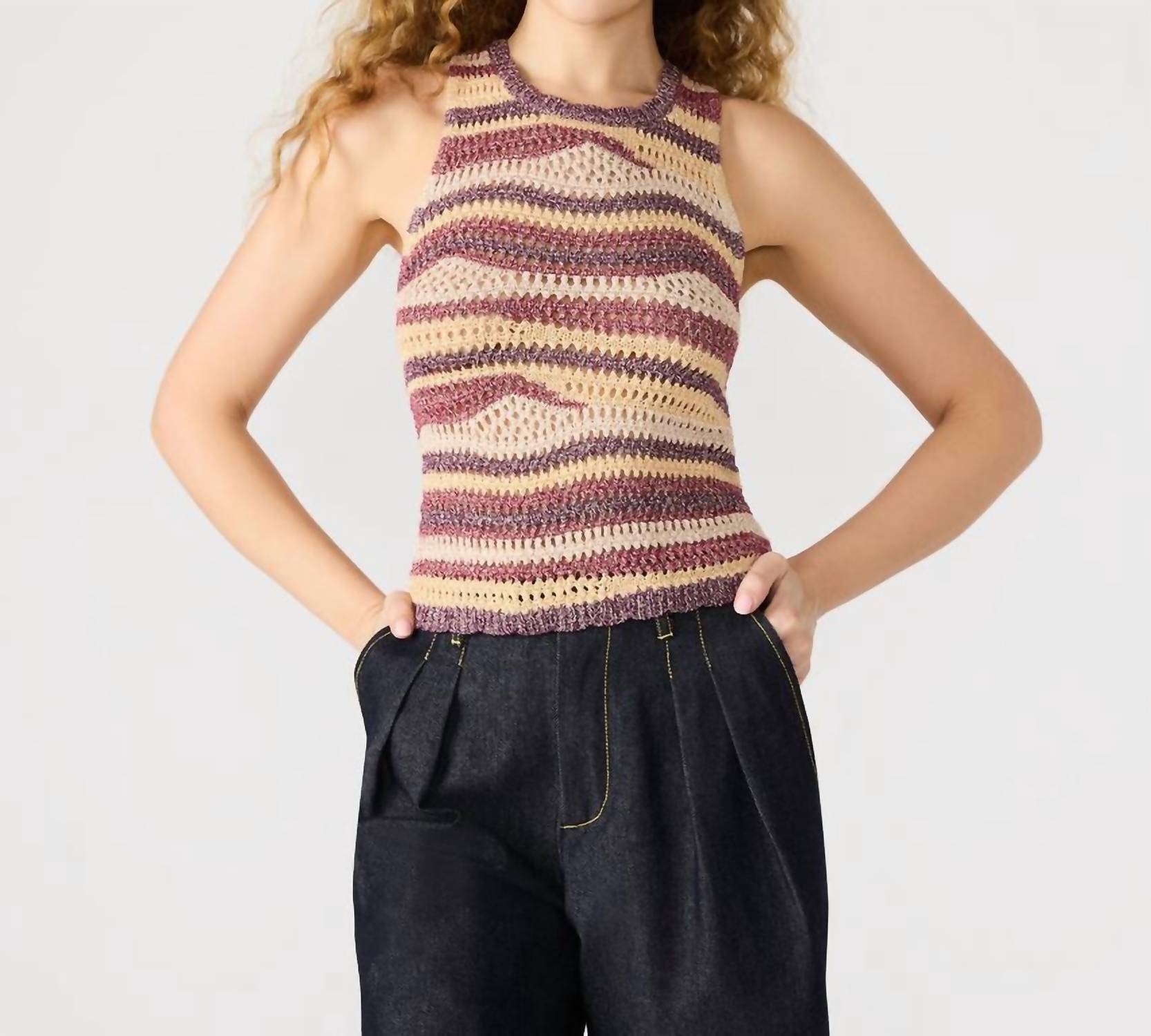 Introducing the Hannah Tank Top by Steve Madden, a boho chic staple perfect for your summer vacation wardrobe. This sleeveless, knit crochet piece stands out with its multi-colored pattern and stylish scalloped hem. Crafted from 61% lyocell, 25% polyester, and 14% metallic, the rust-colored top offers both comfort and texture. Closure: Pull on. Care: Hand wash and lay flat to dry.