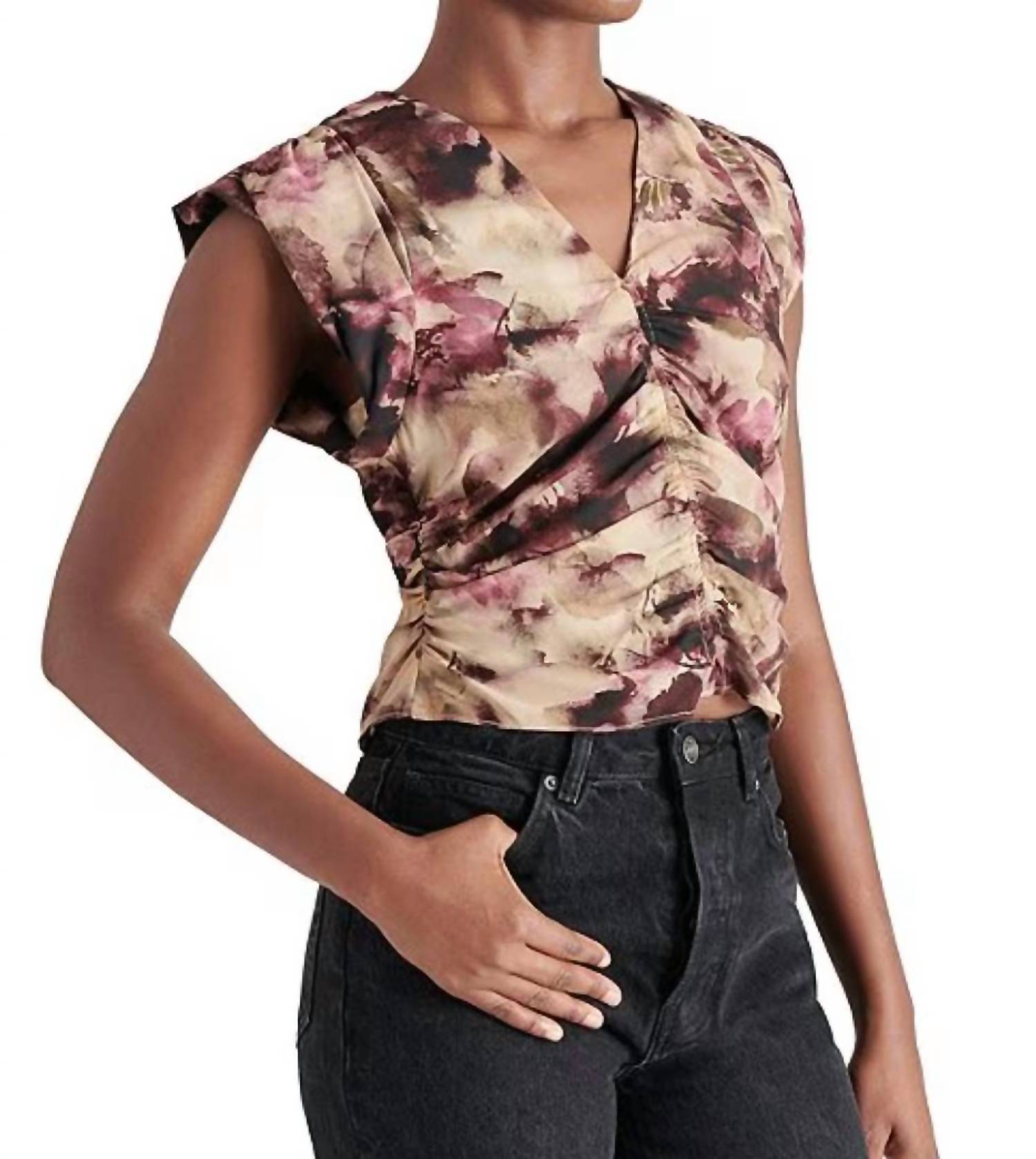 Floral print. V-neckline. Sleeveless. Ruched detail. Pullover construction. Approx. 20" length. 100% Polyester. Hand wash.