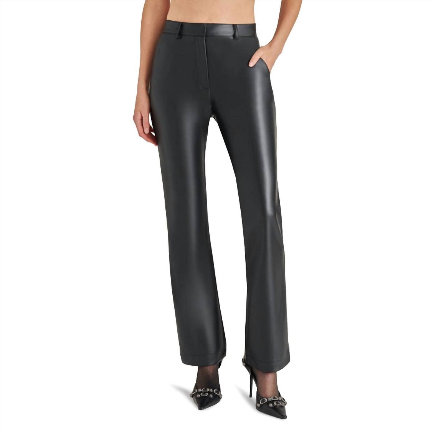 Step into modern sophistication with the Mercer Pant by Steve Madden, available in classic black. These pants are crafted from sleek and slightly stretchy faux leather, featuring a solid pattern and a zip closure for a snug fit. Designed with a baggy straight leg and high-rise waistband, they provide both style and comfort. Ideal for evening events and workwear seasons like spring, these pants also include pockets for added practicality.