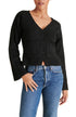 Introducing the Odelia Bell Sleeves Cardigan by Steve Madden, a chic addition to your spring wardrobe. This women's cardigan features long bell sleeves, a V-neckline, and practical front patch pockets for added convenience. Crafted from a nylon blend with 66% acrylic, 23% nylon, 8% lurex, and 3% spandex, it showcases a solid black pattern for a preppy look. Closure is ensured with a button front, and it requires hand washing for care.