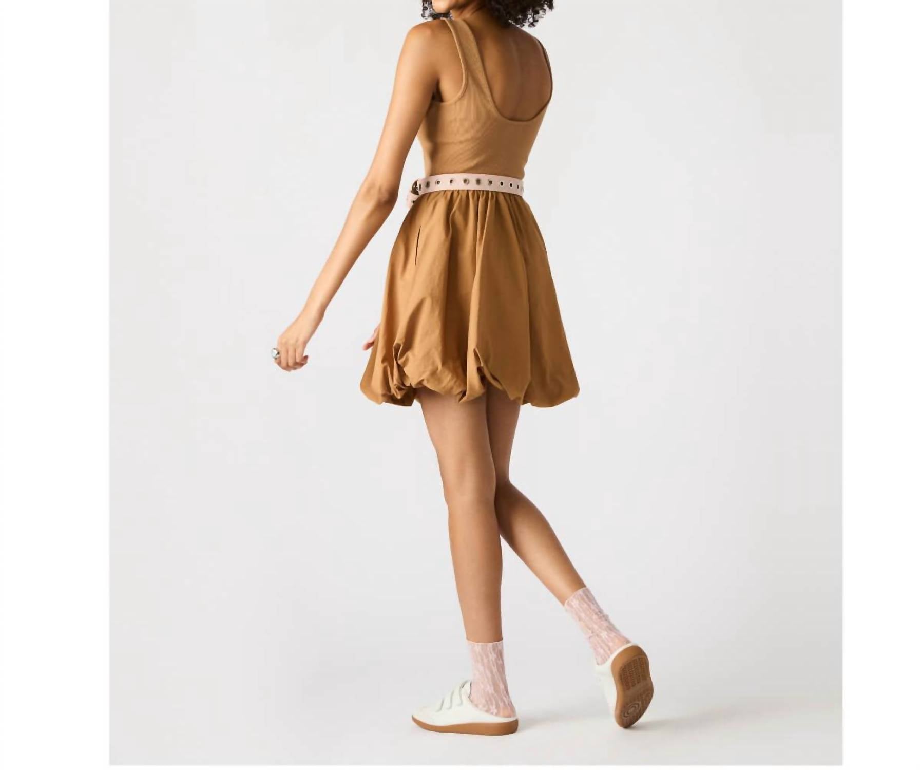 Elevate your wardrobe with the Steve Madden Palermo Mixed Media Bubble Hem Dress in a trendy caramel hue. This sleeveless mini dress features a flattering A-line silhouette with a ribbed cotton bodice for a soft feel and a playful bubble-hem miniskirt. The dress measures 36 1/2" in length, offering a chic look with a scooped back and convenient side-seam pockets. Made from a durable cotton blend, this pull-on style is easy to maintain with machine wash care.