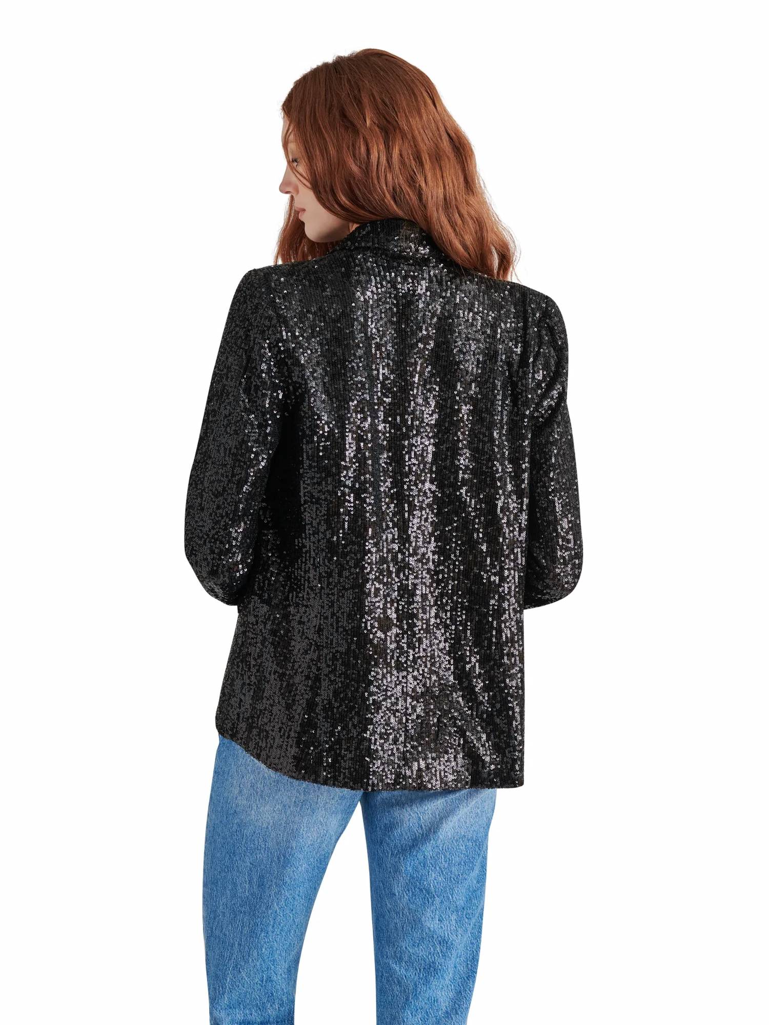 An elevated version of your favorite classic blazer. Elevate your holiday wardrobe with the Payton Blazer by Steve Madden, a statement piece in sleek black designed for festive occasions. Sporting long sleeves and an elegant open front, this blazer is adorned with shimmering allover sequins and features notable shoulder pads. Both the shell and lining are made from durable 100% polyester, ensuring lasting wear. Care for this regular-fit garment by hand washing it in cold water and laying it flat to dry, making it perfect for your next holiday party.