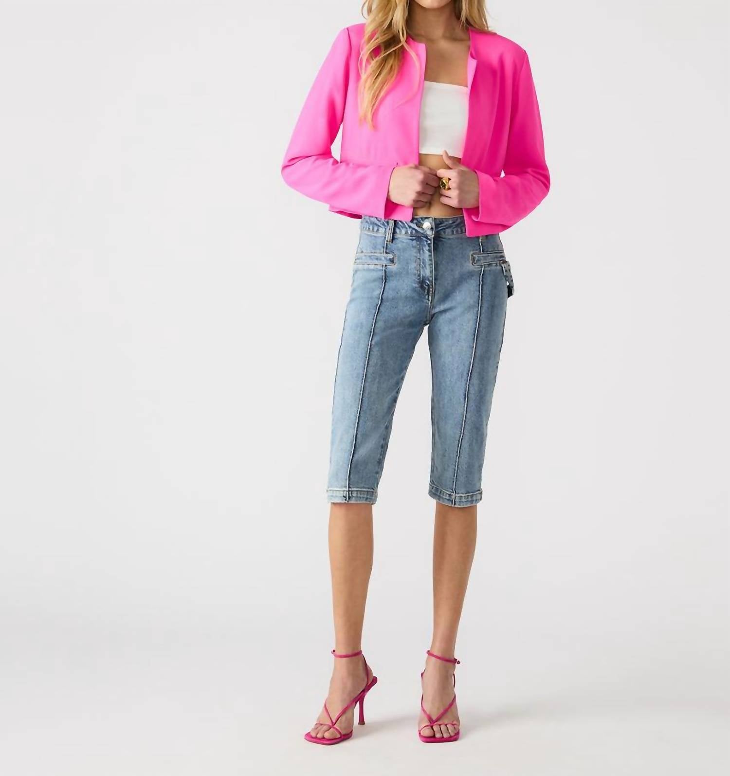 A blazer so versatile you can wear it to the office or pair it with jeans for a more casual look. Elevate your wardrobe with the Serenea Cropped Blazer by Steve Madden, a hot pink statement piece perfect for any occasion. Crafted with long sleeves and an open-front design, this blazer features front flap pockets for added functionality. Composition: 100% Polyester. Care: Hand wash.