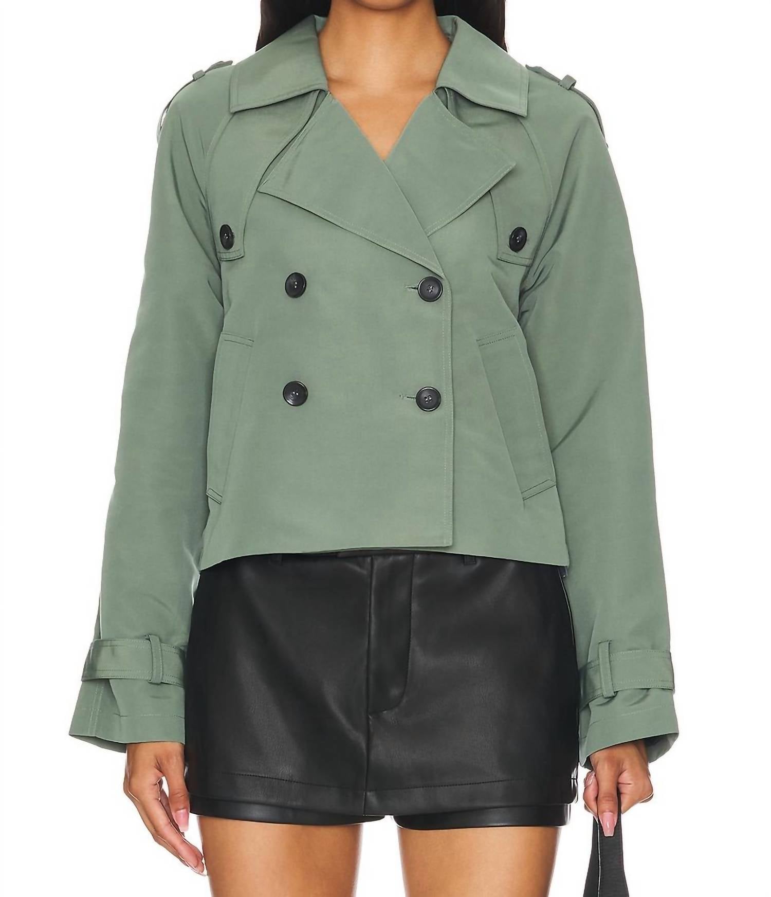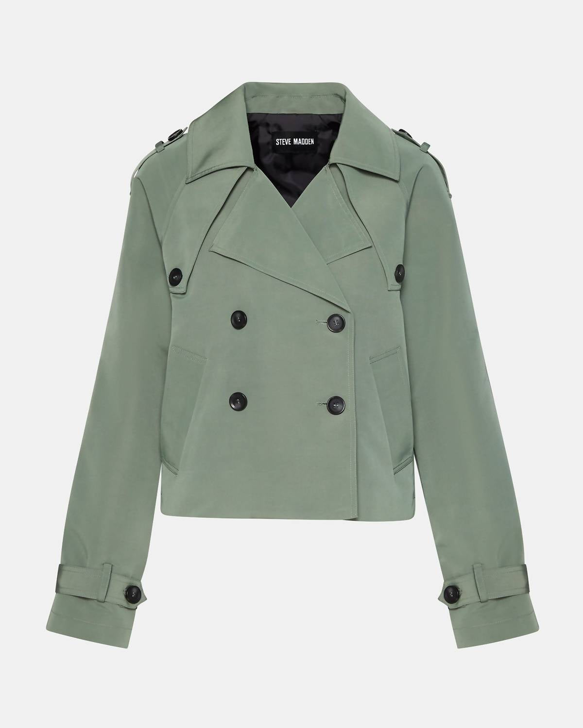 A timeless classic. You'll be reaching for this trench every season. Introducing the Sirus Jacket by STEVE MADDEN, a fashion-forward cropped trench coat in a vibrant green color. Designed with long sleeves and featuring a double-breasted button closure, this coat measures 21.5 inches in length, making it a chic addition to your wardrobe. Crafted from 100% polyester, it includes two functional side pockets and is fully lined for added comfort. For care, hand wash and lay flat to dry for best results.