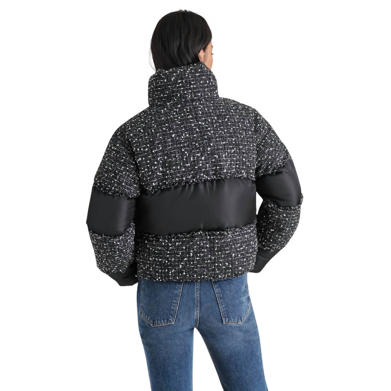 You'll be reaching for this puffer jacket all season long. Color block design in black and white tweed for a trendy, stylish look. Zip-up front for secure closure and easy wear. High collar offering extra warmth and protection from the cold. Puffy sleeves for added insulation and a fashionable silhouette. Zipper closure for a snug fit and easy on/off.