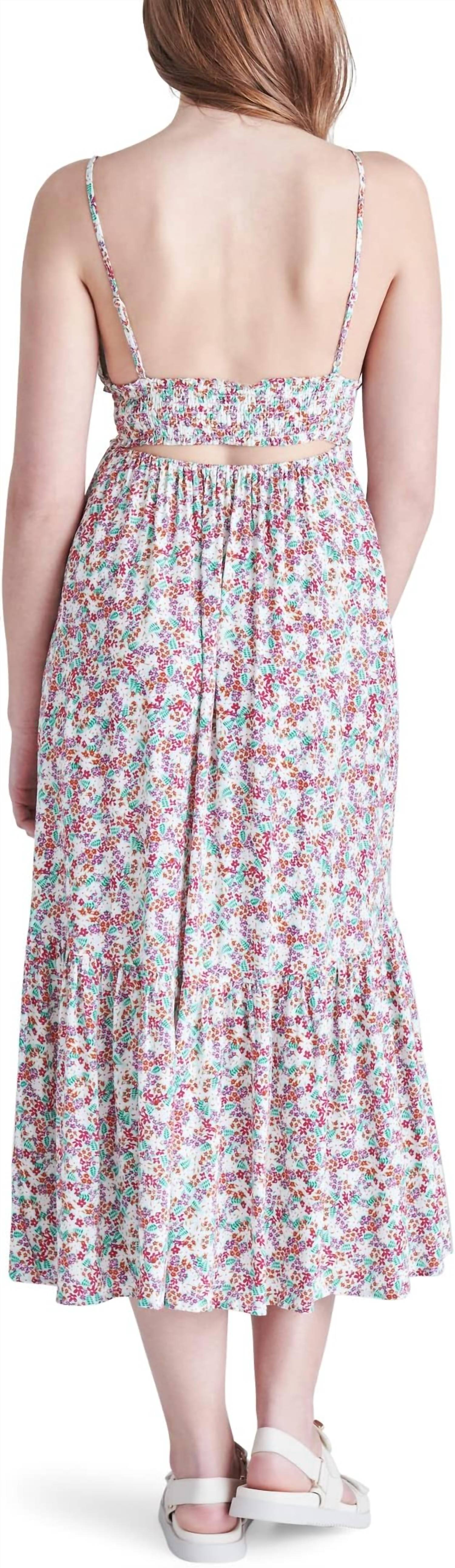 Style this maxi with your favorite statement necklace and sandals for the perfect look. Introducing the Steve Madden Lisa Dress, a charming and unique piece perfect for boho-chic enthusiasts. This sleeveless maxi dress features a deep V-neck with adjustable spaghetti straps and a shirred triangle cups design, all crafted from viscose material. The smocked empire waist with ruffle trim and ruffle-finished shirred hem add to its feminine appeal, while side slit pockets and an elasticized back waist with cutout ensure comfort and style. Closure is a convenient pull-on design, suitable for various occasions, with care instructions allowing for machine washing and tumble drying.