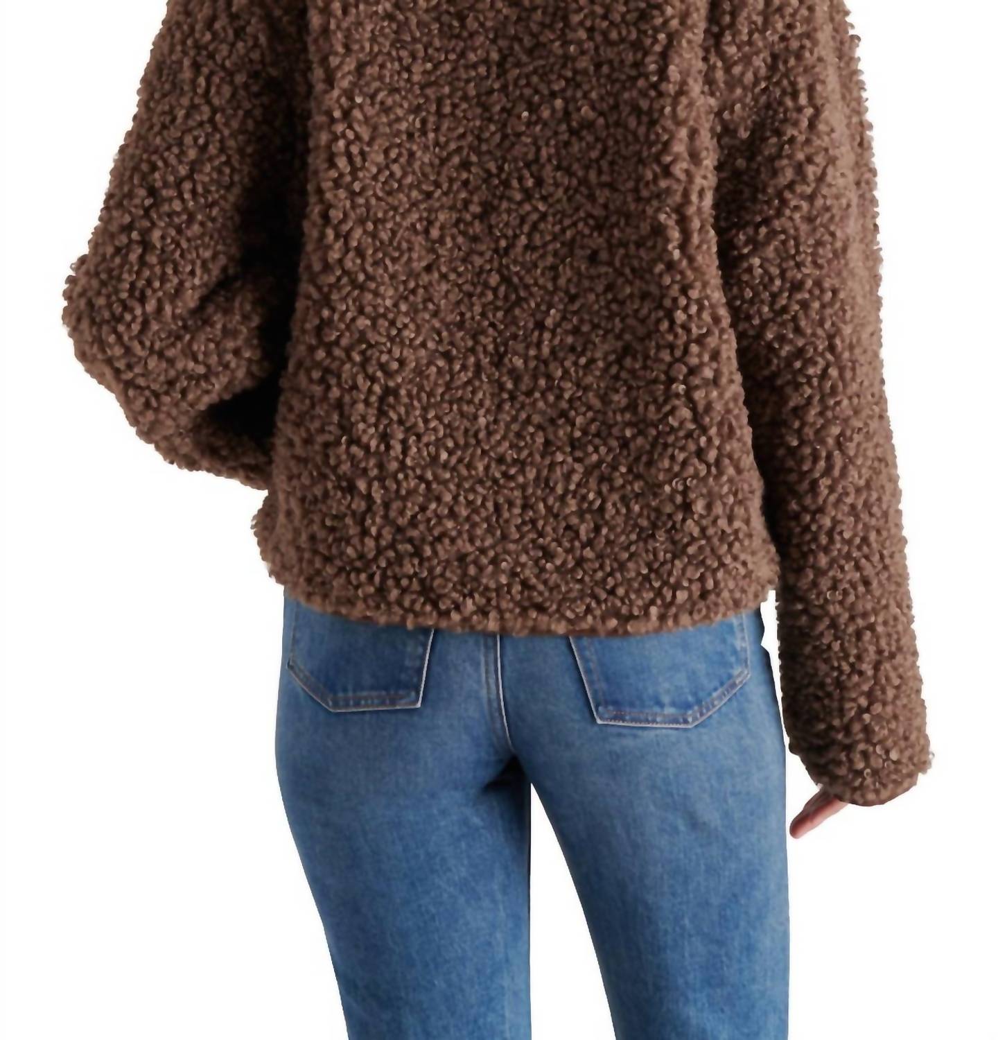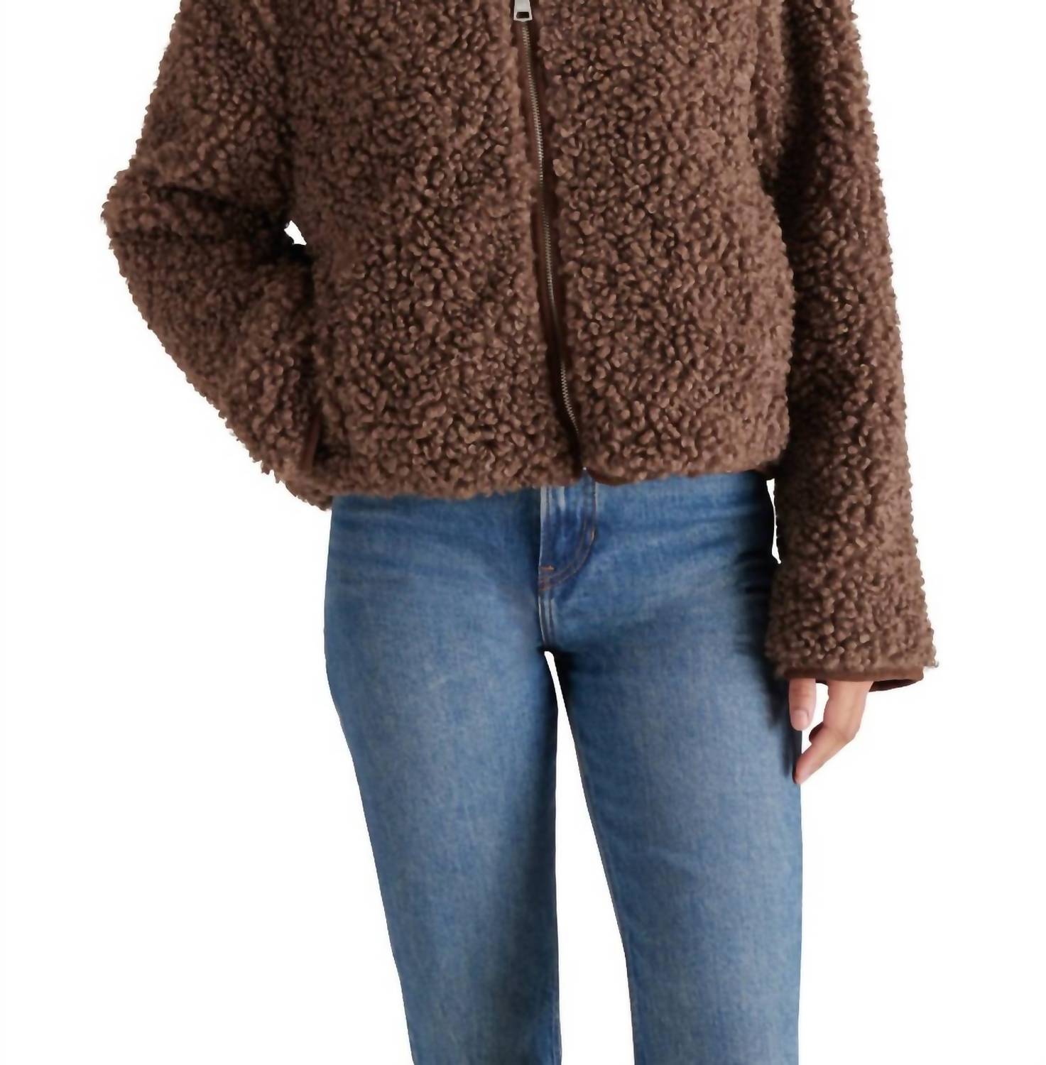 Downright adorable and so comfortable you won't want to take it off. This teddy jacket is a fan favorite. Stay warm and stylish with the STEVE MADDEN Teddy Jacket, crafted for comfort in a Textured Mocha hue. This long-sleeve jacket, made from 100% polyester, features a sleek collarless crewneck design and a practical front zip closure. Perfect for winter travels, it effortlessly combines a minimalist aesthetic with functionality, including pockets for added convenience. Care for your jacket with a simple hand wash to maintain its high-quality feel.