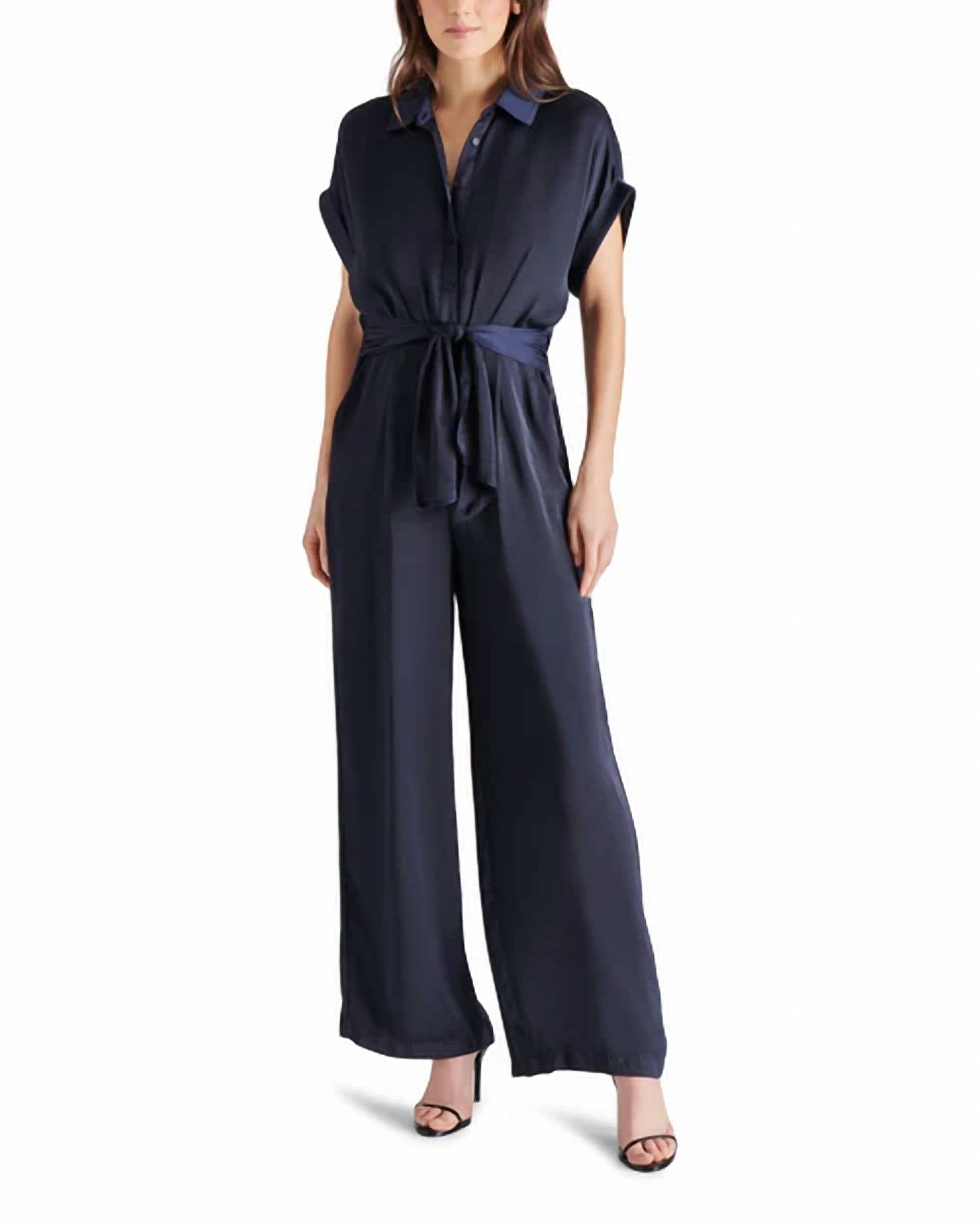 Throw it on and go! Elevate your wardrobe with the Tori Jumpsuit by Steve Madden, a chic addition crafted in a woven navy design. This women's jumpsuit is made from 100% polyester, featuring a wide-leg style and convenient tie closure. Imported for superior quality, it includes pockets for versatility. Care for this solid-patterned piece with a cold hand wash, and lay flat to dry.