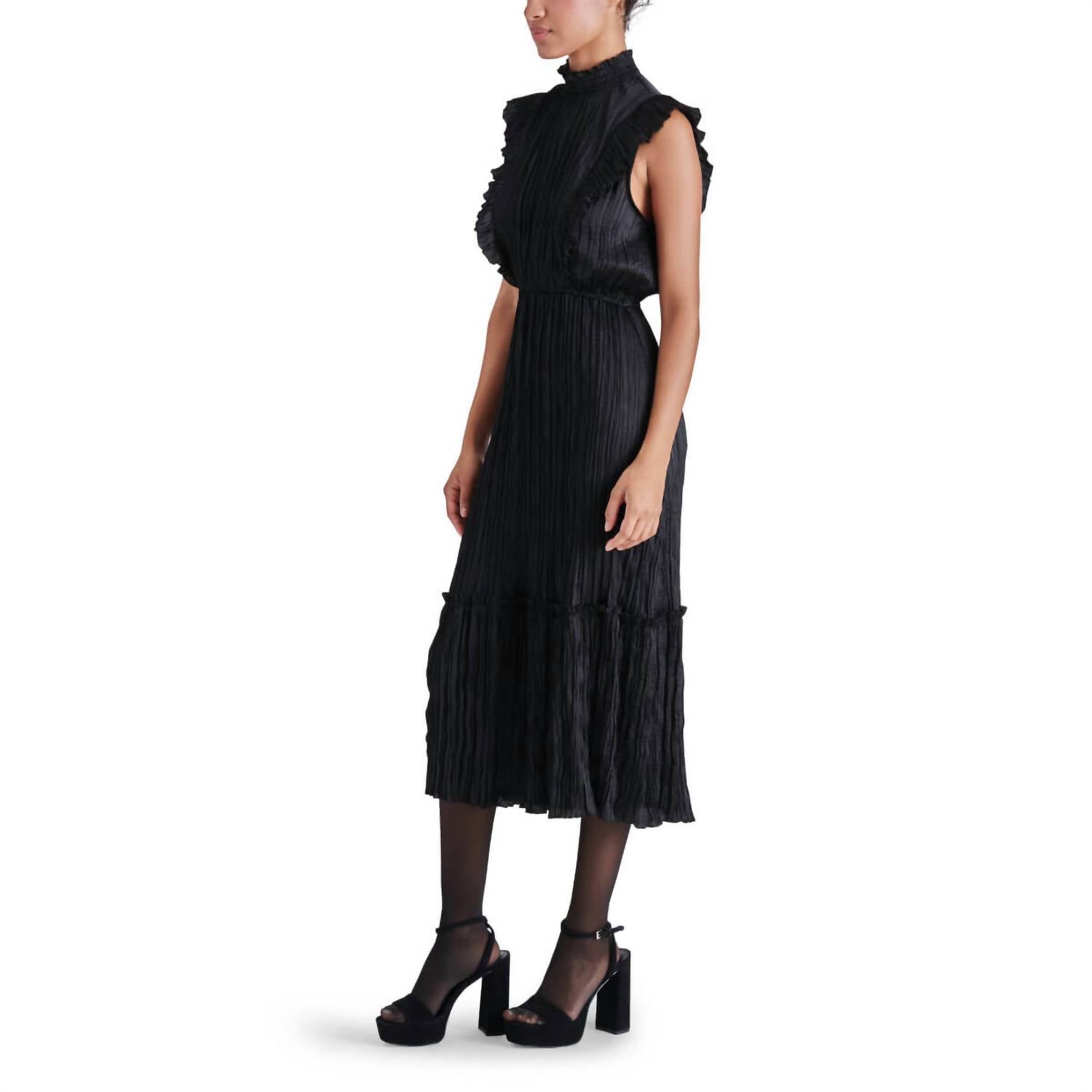 The perfect length dress does exist. Discover the Steve Madden Wednesday Crinkle Satin Midi Dress, a sophisticated choice for any fashion-forward woman. This sleeveless dress features a mock neck and is crafted from 100% polyester, ensuring durability and comfort. With a pull-on closure and a graceful length of 49.5 inches, it falls elegantly below the knee. Made for evening events or Halloween celebrations, this solid black shift dress is best cared for with a hand wash and line dry.