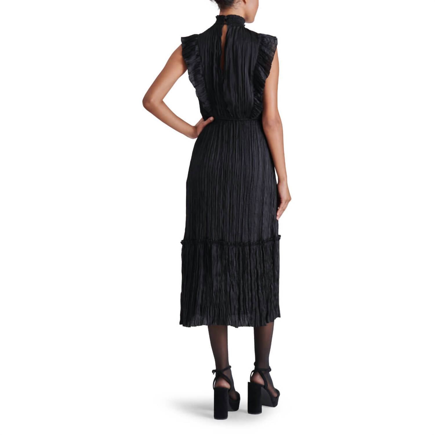 Discover the Steve Madden Wednesday Crinkle Satin Midi Dress, a sophisticated choice for any fashion-forward woman. This sleeveless dress features a mock neck and is crafted from 100% polyester, ensuring durability and comfort. With a pull-on closure and a graceful length of 49.5 inches, it falls elegantly below the knee. Made for evening events or Halloween celebrations, this solid black shift dress is best cared for with a hand wash and line dry.